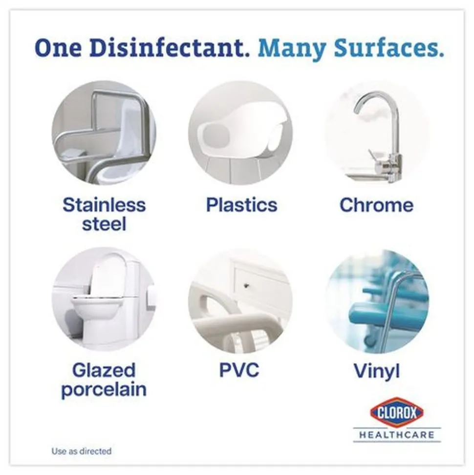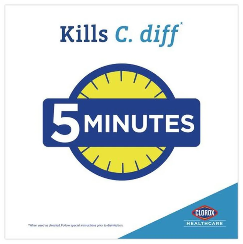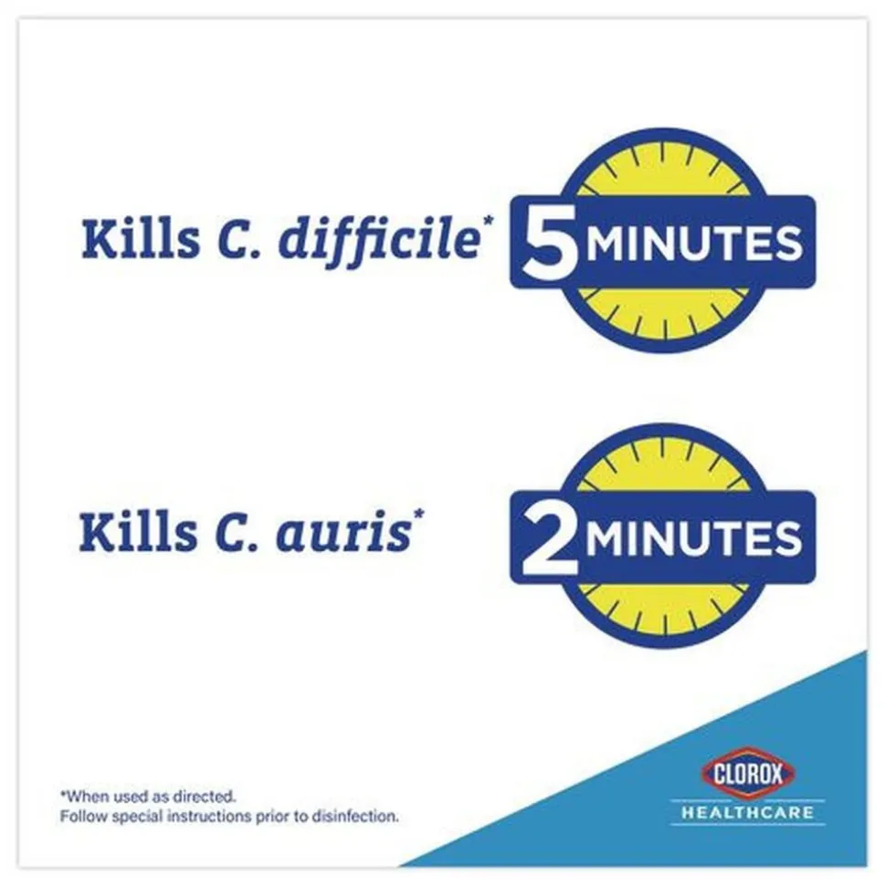 Clorox Healthcare Spore Defense is your low odor, easy-on-surfaces cleaner disinfectant for facility-wide use. This open-system cleaner disinfectant kills 56 microorganisms including C. difficile spores in five minutes and acts as a Bactericidal, Virucidal and Fungicidal in three minutes or less. It is also EPA registered to kill Candida auris, considered an urgent antibiotic resistant pathogen threat by the CDC. This Spore Defense cleaner meets EPA criteria for use against SARS-CoV-2, the virus that causes COVID-19 on hard, nonporous surfaces when used as directed. Compatible with a wide variety of surfaces including acrylic, chrome, aluminum, plastic, vinyl, glazed porcelain, PVC, plastic and stainless steel, this spore cleaner is suited for use on floors, bed frames, infant incubators, showers, stretchers, wheelchairs and more. Ideal for use in clinics, doctor offices, emergency rooms, hospitals, patient rooms and more.