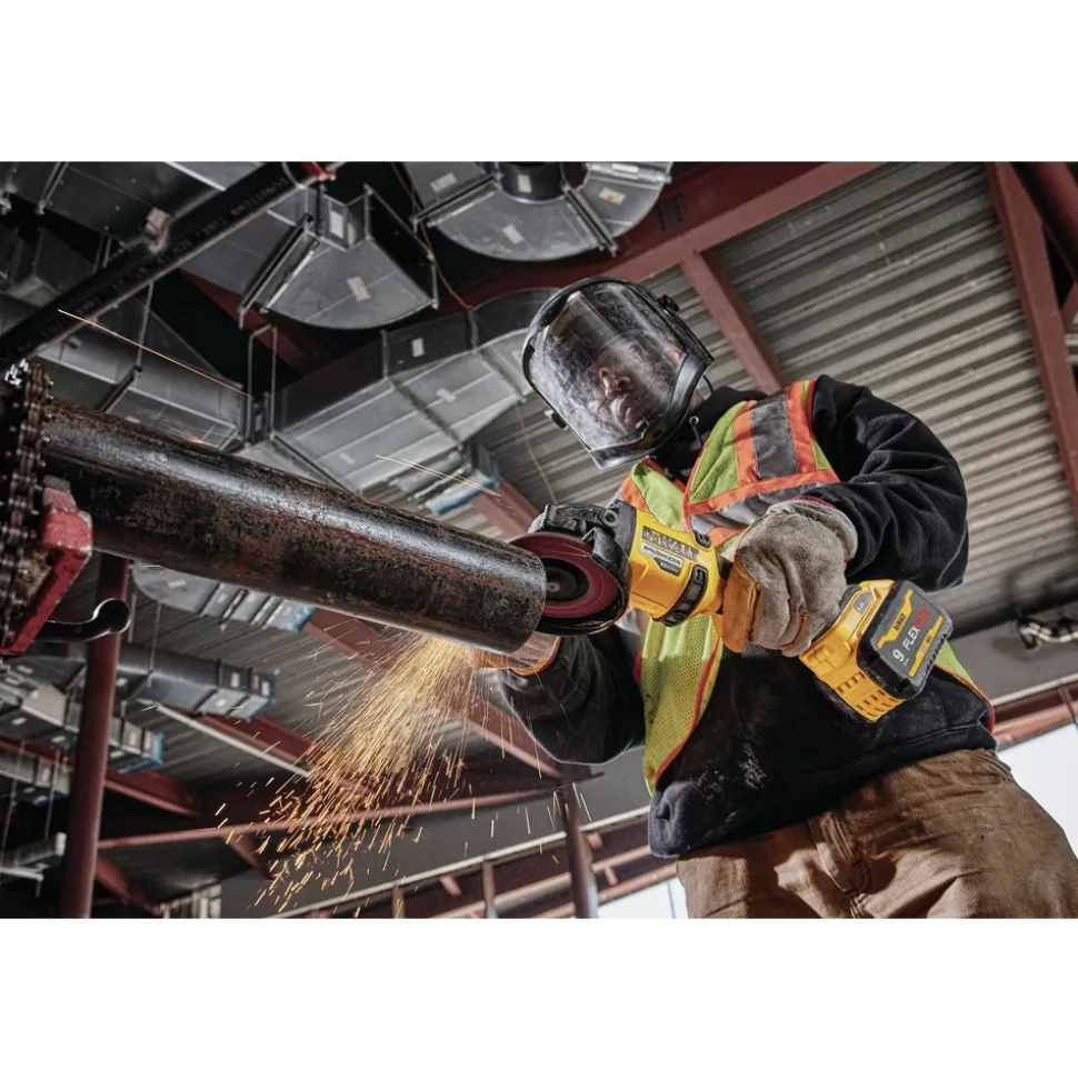 Our most powerful tools just got better with the FLEXVOLT 60V MAX 4-1/2 in. – 6 in. Grinder. It has up to 30% more power than the DCG414 60V MAX Grinder with 2300 unit watts out. This grinder delivers 13 Amp power with a no-load speed of 9000 RPM. It’s part of our PERFORM and PROTECT product line to help keep users safe. The Kickback Brake engages when a pinch, stall, or bind-up event is sensed and shuts the grinder off. Battery and charger sold separately.