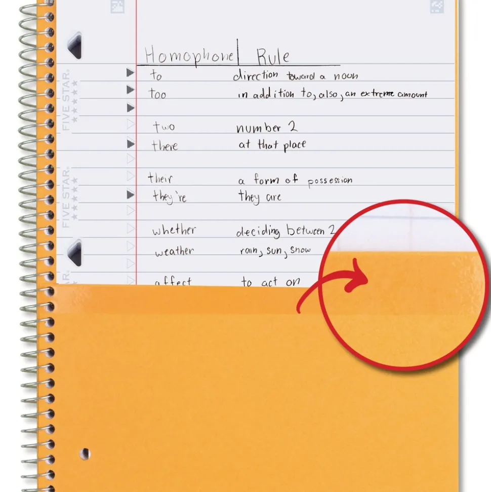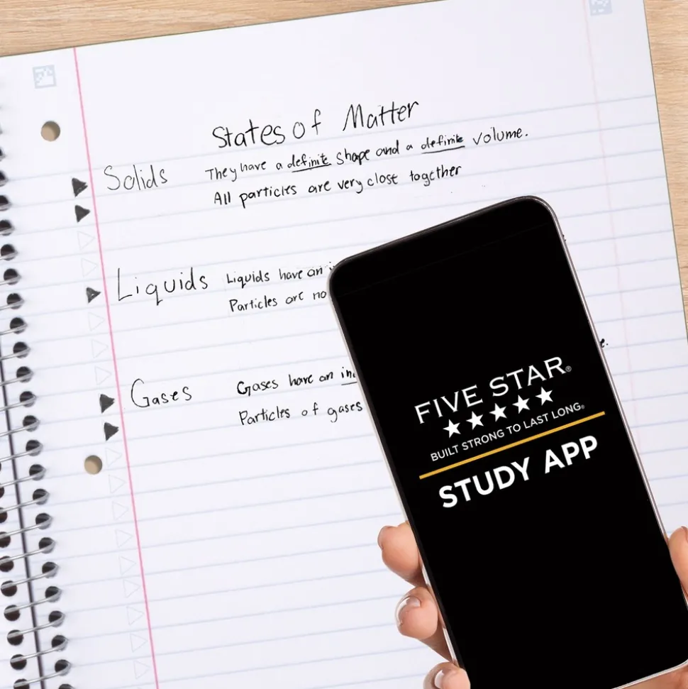Lasts all year. Guaranteed! Durable, water-resistant poly covers protect your notes all year. Reinforced, tear-resistant divider pockets keep your loose sheets together. Spiral Lock wire binding prevents coil snag, and high-quality paper provides excellent ink-bleed resistance. Easily inserts into any three-ring binder (sold separately). Scan, study and organize your notes with the Five Star Study App. Create instant flashcards and sync your notes to Google Drive to access them anywhere from any device.