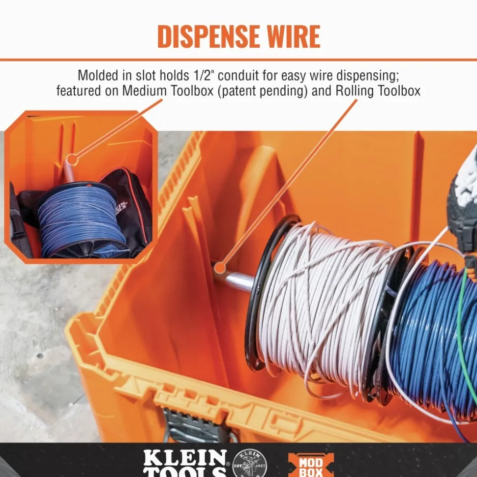 Klein Tools MODbox Rolling Toolbox has 10 in. solid rubber wheels that are larger and more durable than the leading competitor. The retractable handle is easy to remove for storage in tight spaces. Bring more tools to the jobsite with side rail attachments and back stowage compartments. Rolling Toolbox is IP65 rated, 250 lbs. (113.4 kg.) capacity, and made with impact resistant polymers. Easily connects with other MODbox components to make a custom mobile workstation.
