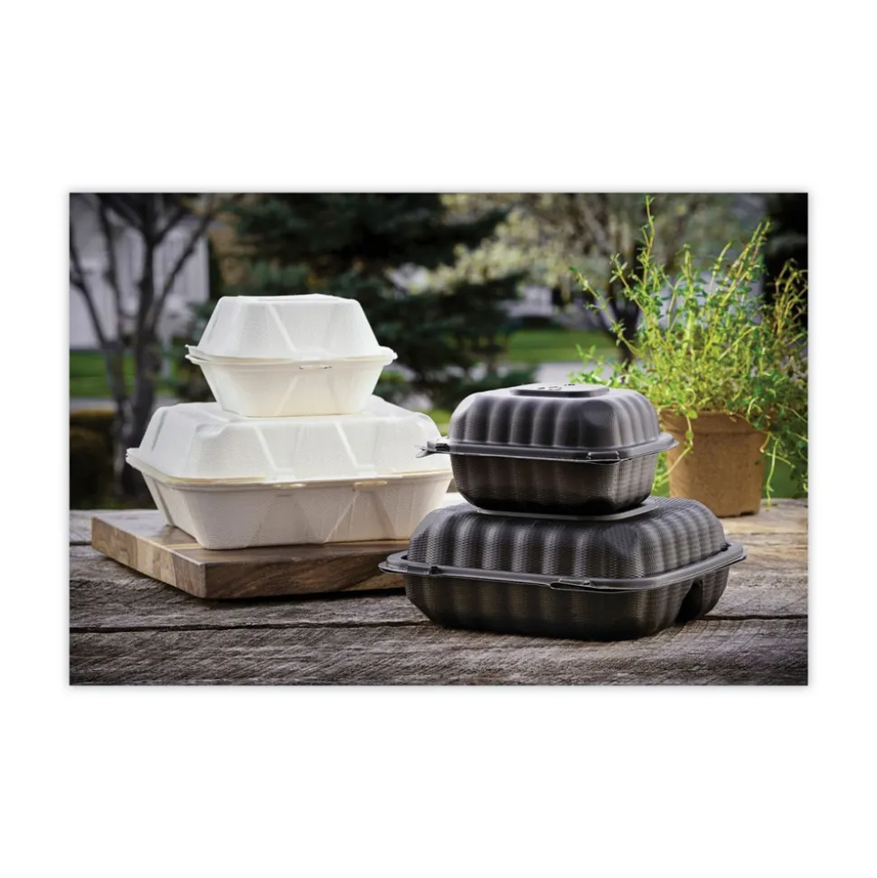 Pactiv Corp. YCNB06000000 EarthChoice 5.75 in. x 5.95 in. x 3.1 in. Microwavable MFPP Plastic Hinged Lid Container With SmartLock – Black (400/Carton)