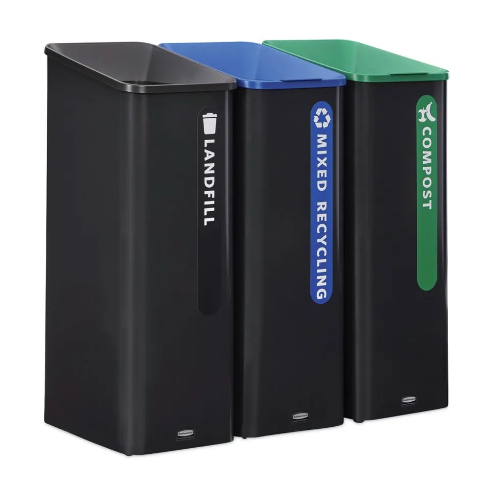 Rubbermaid Commercial Products Sustain Containers are a decorative and adaptable recycling solution made to improve your facility’s sustainability compliance. Modular system allows the container stations to be customized and grow with each recycling program’s needs. Restrictive waste stream openings and colored labels provide easy visual cues for patrons, making recycling easier and improving compliance with growing regulations.