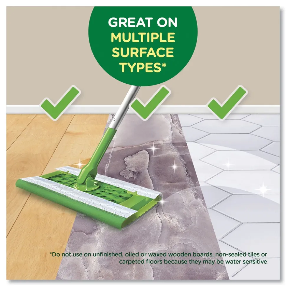 Premoistened cloths for 10 in. Swiffer sweeper. Wet wipes with a unique cleaning solution work to dissolve tough spots. Convenient disposable wipes remove dirt and grime. Safe for use on linoleum, vinyl, ceramic and finished wood floors. Swipe floors clean and throw wipes away – no rinsing required.
