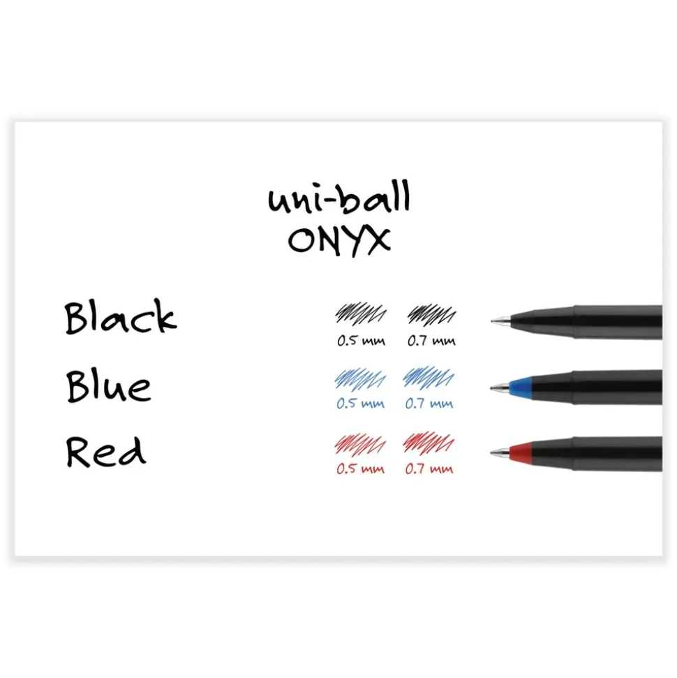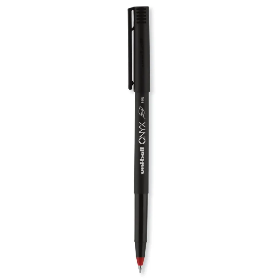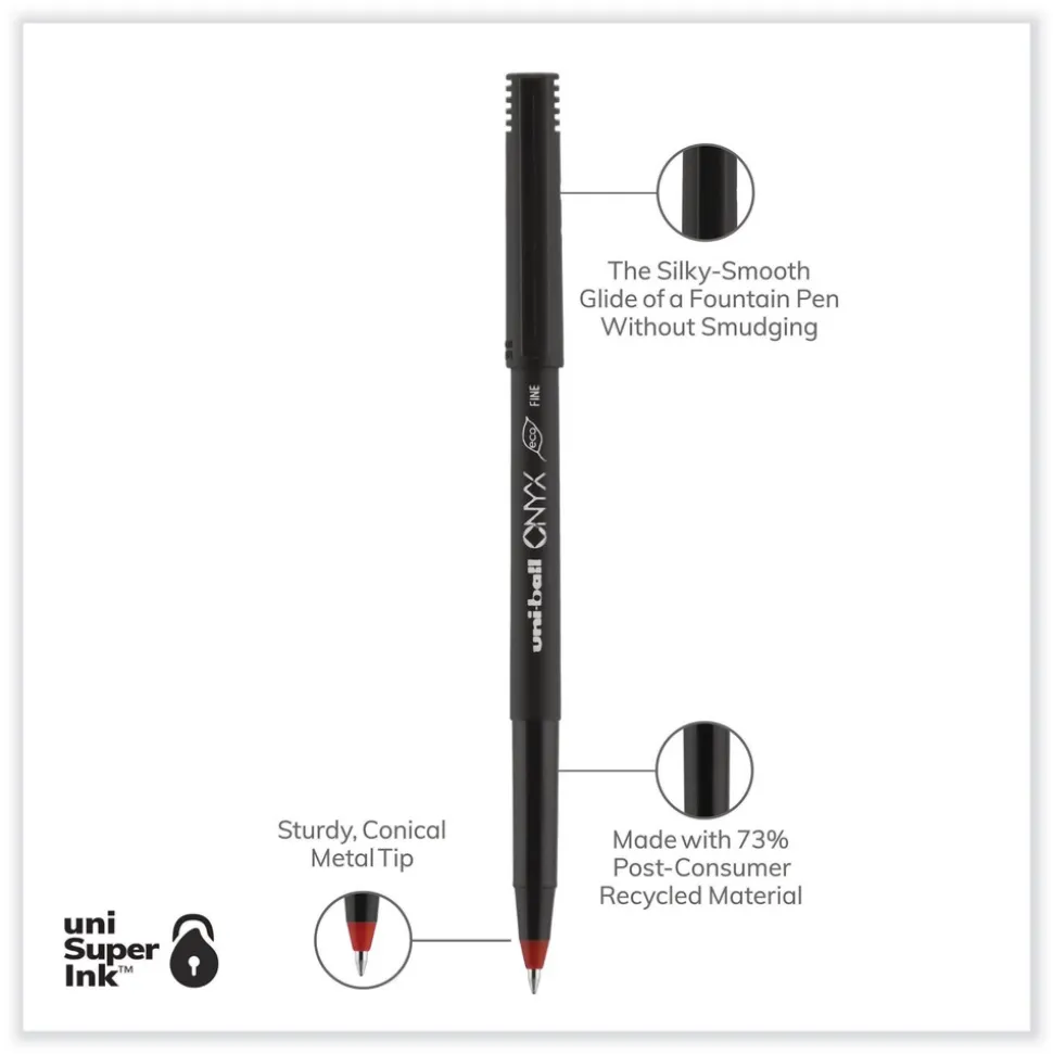 Stock your office, home or classroom with Onyx Rollerball Stick Pens from uni-ball featuring strong, long lasting tip sizes. This rollerball pen delivers the silky-smooth glide of a fountain pen without smudging for effortless writing. ONYX pens produce crisp and precise lines for intricate writing, making it easy to create super fine details in your drawings and diagrams. Capped roller pens are useful for a variety of tasks from note taking to signing checks and legal documents to uniquely embellishing fun and creative writing projects. Innovative uni Super Ink technology forms a strong bond with the paper, protecting from water, fading and fraud. A great economic and environmentally-conscious choice as this super sleek micro point roller pen is made from post-consumer recycled material.