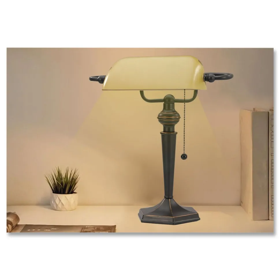 Classic design adds sophistication and elegance to any office, study, or home den. Refined glass shade rotates to pilot light direction. Classic pull chain for easy on/off power. 13W CFL bulb is included.