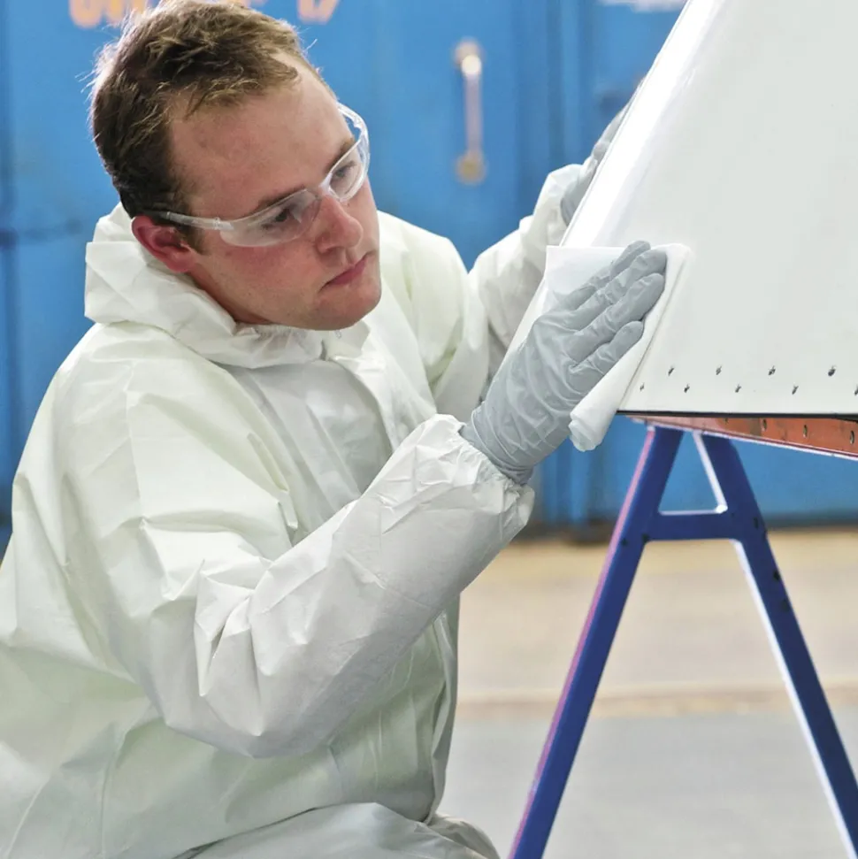 Ensure safe working conditions. Lightweight and comfortable microporous film laminate provides an excellent liquid and particulate barrier. Zipper front keeps the coveralls easy to put on and take off. Reliable apparel for applications such as liquid handling, pressure washing and general industrial tasks.