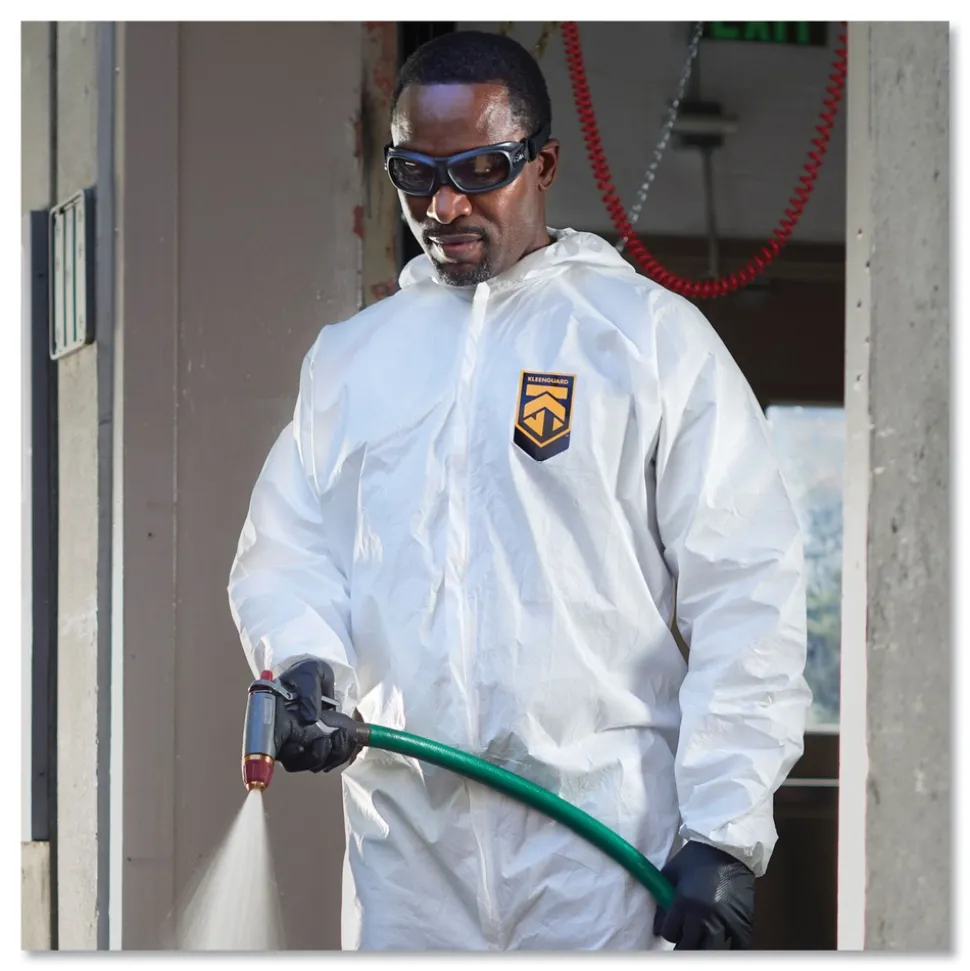 KleenGuard Personal Protective Equipment (PPE) enables rather than inhibitsallowing for maximum productivity and safety for you and your employees. When your workers are in nonstop contact with liquid splashes and particles, KleenGuard A40 Liquid and Particle Protection Coveralls are a great addition to offer your team comfortable protective clothing. Features to provide more protection include the seamless front (for primary exposure area) and 1 inch zipper flap. They feature REFLEX design, which offers excellent fit and comfort (with elastic in the back) and freedom of movement. Made of breathable, microporous film to keep out debris, non-hazardous liquid chemicals and dry particulates, the KleenGuard A40 material gives your employees a better liquid barrier and a better particulate barrier than the leading competitor. These coveralls with hood pass NFPA 99 for antistatic materials, and pass ASTM F1670 testing for penetration of blood and bodily fluids. Popular industries using this product include liquid handling, aviation, pharmaceutical manufacturing, general manufacturing and so much more. Making the right Personal Protection choice is difficult. Perform with distinction with KleenGuard Personal Protective Equipment (PPE).