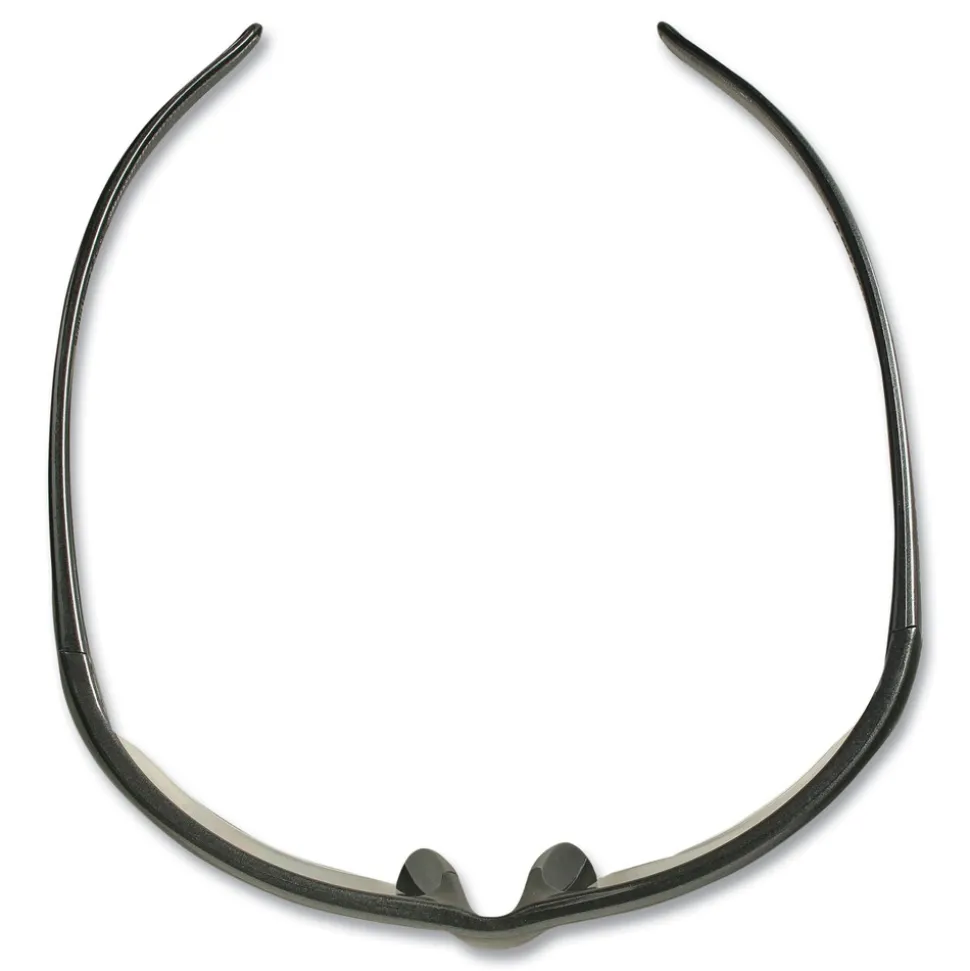 Stylized frame features a cutting edge design that is ideal for work and play. Sport grip temples eliminate slippage. Dual lenses with an 8-base curve provide wrap-around protection.
