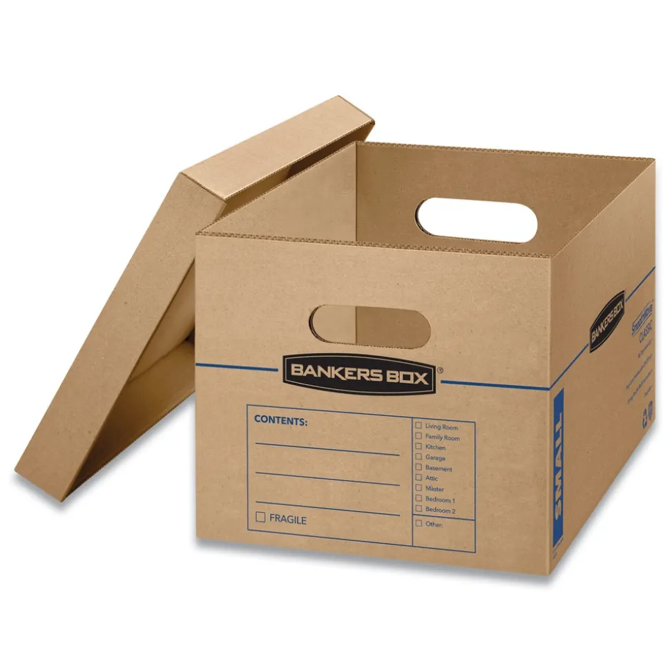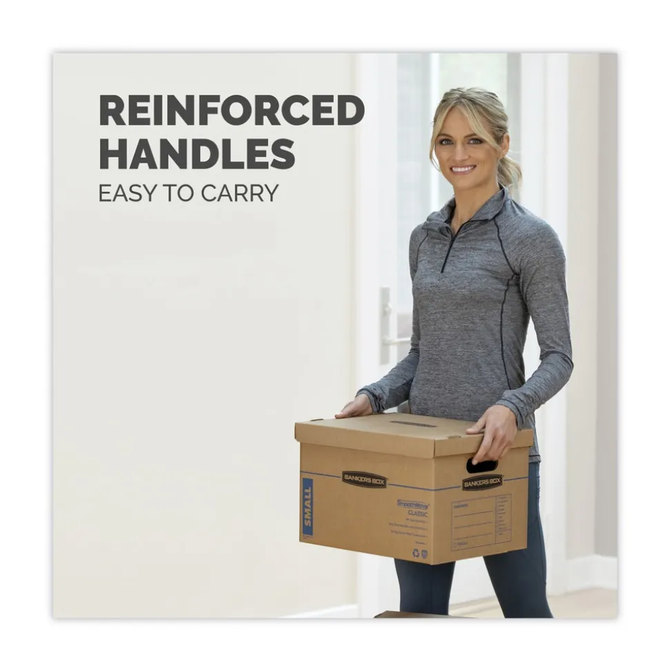 Bankers Box SmoothMove Classic Moving and Storage Boxes feature easy set-up—no tape required for box assembly. Convenient lift-off lid. Easy to carry handles. Durable, double end, double bottom, 32 ECT B-Flute Kraft corrugated board construction. Reusable and recyclable. Perfect for use in the office, home, school, or wherever you would like to move and store important papers, documents or any items.