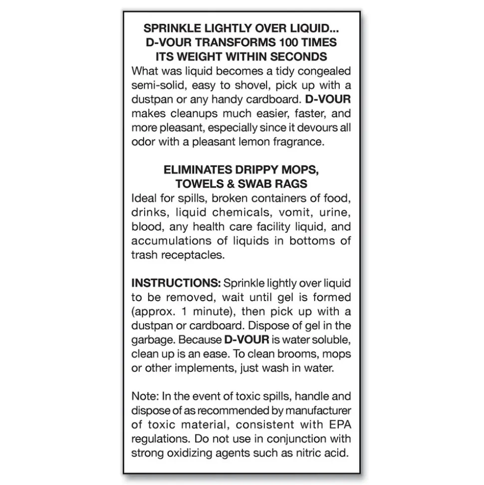 BIG D D-VOUR devours liquids such as spilled bodily fluids as it eliminates odor. D-VOUR is a polymer which, when sprinkled lightly on liquid, transforms it in seconds to a tidy, congealed semi-solid, easy to pick up and dispose of. D-VOUR will absorb 100 times its weight. D-VOUR changes smelly liquids into an odorless semi-solid mass for fast, easy clean-up. Ideal for spills in grocery stores, restaurants, health care facilities or schools. Use D-VOUR to set free-flowing liquids (except for oils) and destroy odors fast.