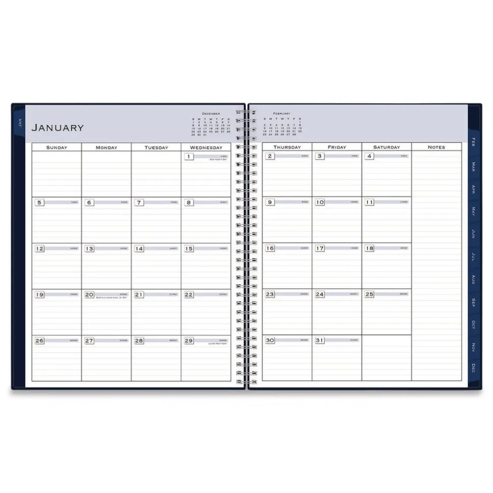Add sophisticated appeal to appointment scheduling and planning tasks with the “Passages” sleek and professional weekly appointment book and monthly planner. Weekly spreads feature an extended, vertical column format for meticulous appointment scheduling across the whole week, including Saturdays and Sundays, plus an eighth ruled column for additional notes and comments. For longer-range planning and additional notetaking, the tabbed monthly views deliver a standard, daily block format as well as their own ruled notes column for lists and comments on every other page. Six past-year, untabbed monthly spreads help you transition into the new year, while additional pages for yearly goals, contacts, important dates and more help you stay on track. Durable, twin-wire binding allows the book to lie flat when open, and thick, high-quality paper stock minimizes the potential for ink bleed through.