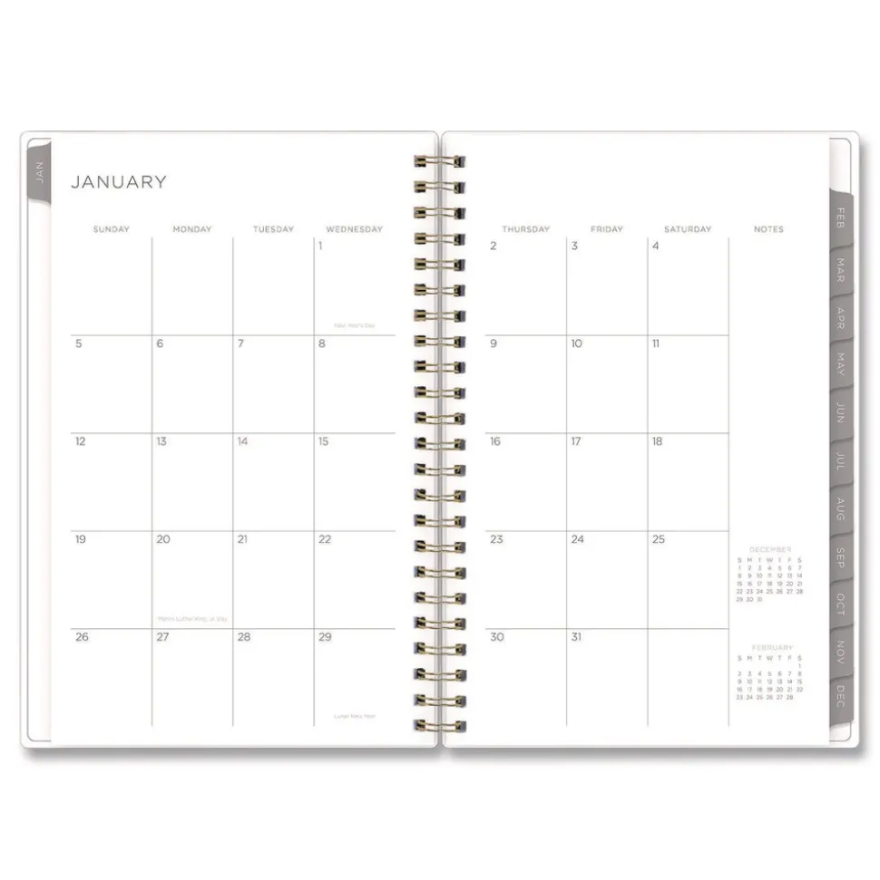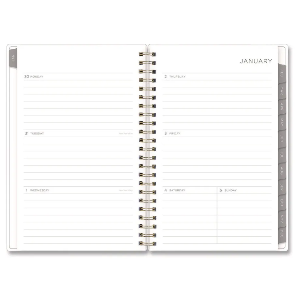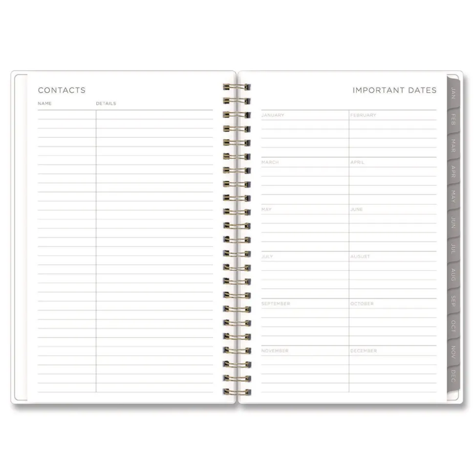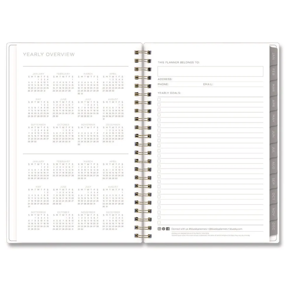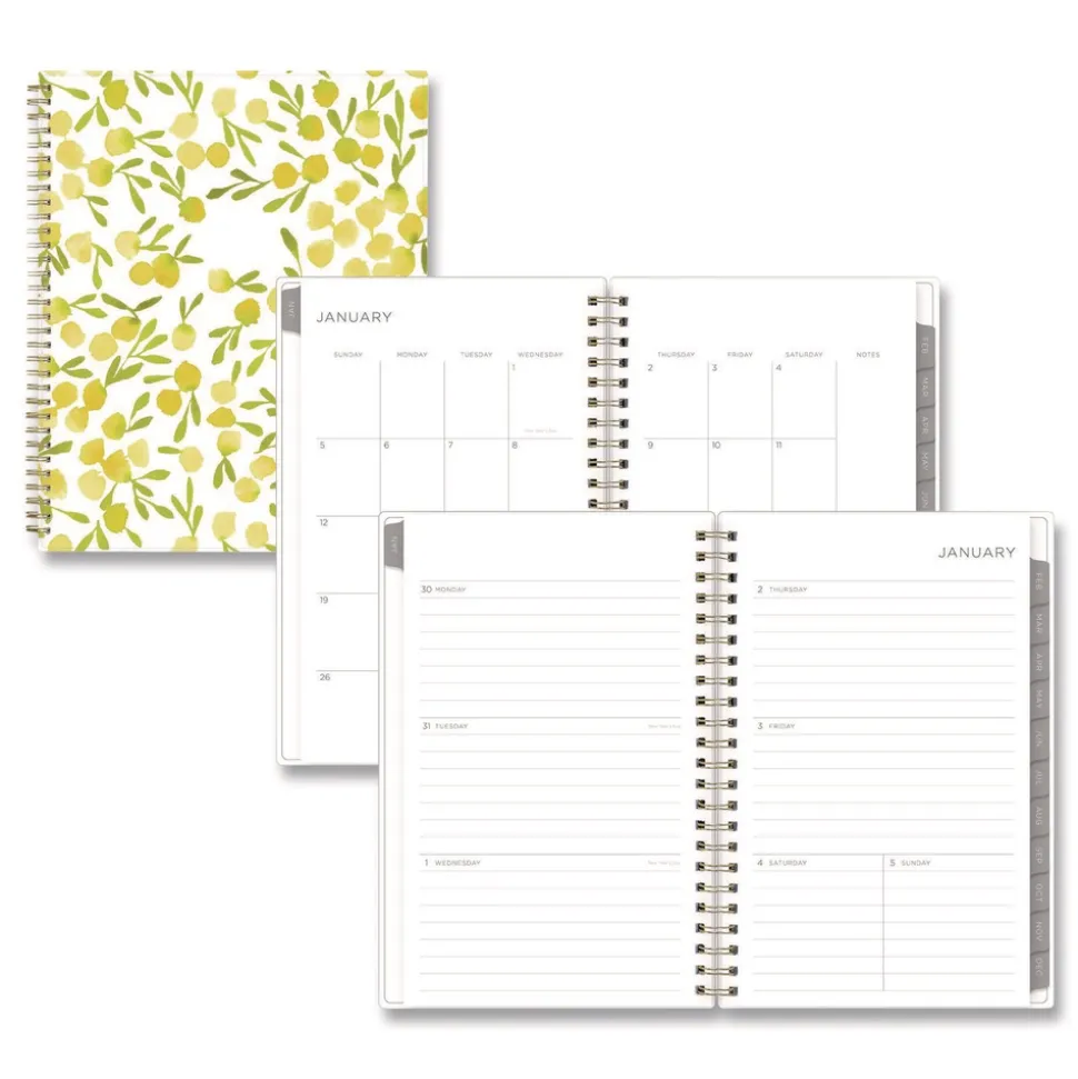 Stay focused and uplifted with this beautiful Kelly Ventura for Blue Sky planner! The fresh abstract lemon artwork will keep drawing you back in, making your organization dreams come true. The planner’s flexible, open-format weekly spreads and tabbed monthly views provide lots of space for all your planning and scheduling needs. Six past-year, untabbed monthly spreads help you transition into the new year, while extra resources at the back of the planner help you track yearly goals, contacts, important dates and more. Durable, twin-wire binding allows the book to lie flat when open, and thick, high-quality acid-free paper minimizes the potential for ink bleed through. The planner features gold-toned twin-wire binding.