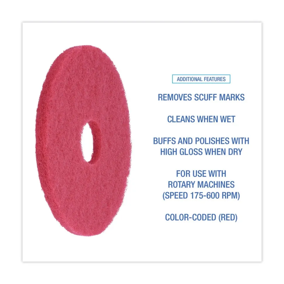 More value for your money with a versatile floor buffing pad that cleans when wet and buffs when dry. Made from non-woven polyester fibers, the buffing pad cleans and removes scuff marks while polishing floors to a high gloss. Color-coded for easy job identification. Quality pad constructed from durable fibers that require less replacement. For use with Floor Machines (Speed of 175 to 600 RPM).
