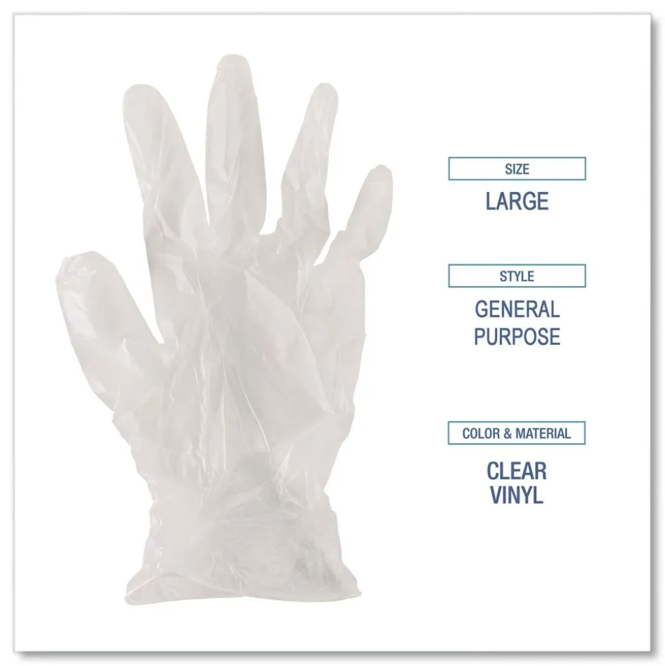 Convenient vinyl general purpose powder free gloves provide excellent tactile sensitivity and hand protection. These gloves are ideal for users who are at risk of becoming sensitive to latex protein allergens. Quick and easy to dispense and put on. Safe for food contact applications. Gloves offer unparalleled economy, functionality, and value. Box is also a dispenser with perforated, removeable opening on top that allows single glove dispensing.