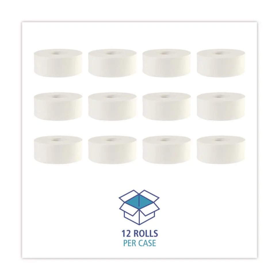Boardwalk JRT Jumbo Roll Bathroom Tissue is the economical and reliable choice for high-traffic restrooms. Save time and money by replacing the roll less often with wide roll diameter tissue. Reduce your chances of running out with a long-lasting roll you can rely on. Industrial size roll is ideal for public restrooms where there is not an attendant on-duty. Embossed for added comfort and absorbency.