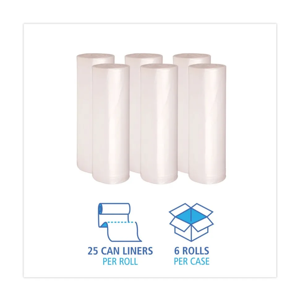 High-density polyethylene liners provide superior performance at an affordable price. Made from 100% Prime resin for added strength and durability. The sturdy, star-seal bottom helps prevent leaks and provides even weight distribution for easy removal from receptacle. Coreless perforated rolls are easy to use and great for dispensing on the go. A quality can liner that provides trusted waste collection for light-duty applications.