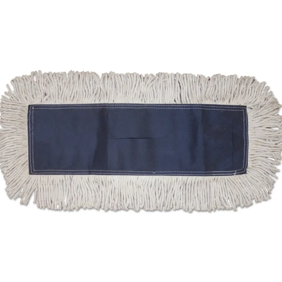 4-ply, pretreated yarn, dust mop head. Equipped with a slot pocket backing which allows a metal dust mop frame to slide into its place quickly and easily. Sewn center fringe for added coverage and durability. The disposable head can be discarded when dirty. Ideal for use on floors that require dusting, with or without cleaning spray. Handle and frame are sold separately.
