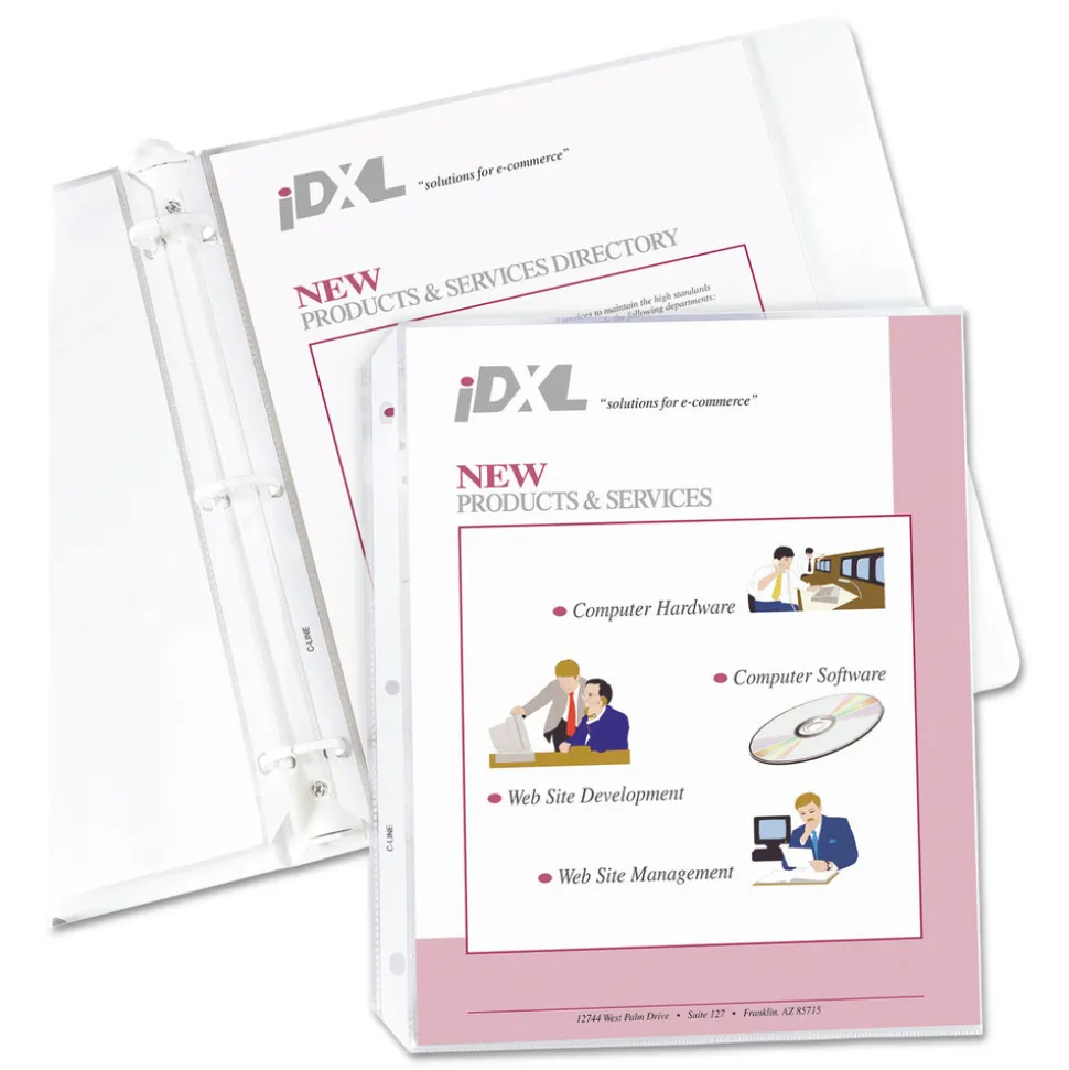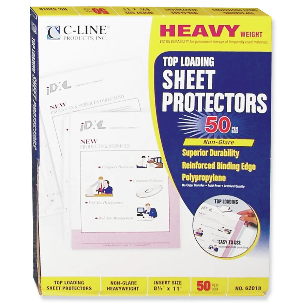 Sheet protectors are widely used as a tool to keep documents in their original condition. Once inserted into the holder, the documents instantly have a plastic, protective cover, which will help eliminate damage and tearing while they are being stored. This is especially important for high-use documents that are accessed on a regular basis. Document holders have strong, reinforced edges, which prevent tears. Top-loading sheet protectors are pre-punched to fit standard three-ring binders. This allows for documents to remain in their original state. The acid-free polypropylene material eliminates photocopy transfer. Sheet protectors are a durable storage option for important documents and reference materials. This product will be cheerfully replaced with one of equal value if defective in materials, manufacturing or packaging at the time of purchase. Except for such replacement, this product is sold without warranty or liability even though defect, damage or loss is caused by negligence or other fault.