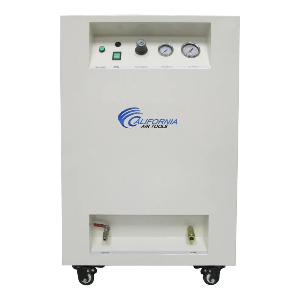 The California Air Tools 8010SPC Ultra Quiet and oil-free Air Compressor in a Sound Proof Cabinet is designed to be one of the quietest 1.0 HP electric air compressors in the industry having only 40 decibels of sound. The powerful 1.0 HP motor operates at only 1400 RPM creating less noise and less wear. The oil-free Dual Piston Pump System is engineered for high performance and durability. This air compressor delivers 3.00 CFM at 90 PSI with maximum pressure of 115 PSI. The Sound Proof Cabinet is insulated with sound reducing foam to reduce noise and vibration. The two latching doors allows for easy access to the air compressor and components. The 4 caster wheels make moving this air compressor from location to location very easy. The California Air Tools 8010SPC Air Compressor is designed for anyone who must have a Ultra Quiet Air Compressor in their office, shop, store, warehouse or home.