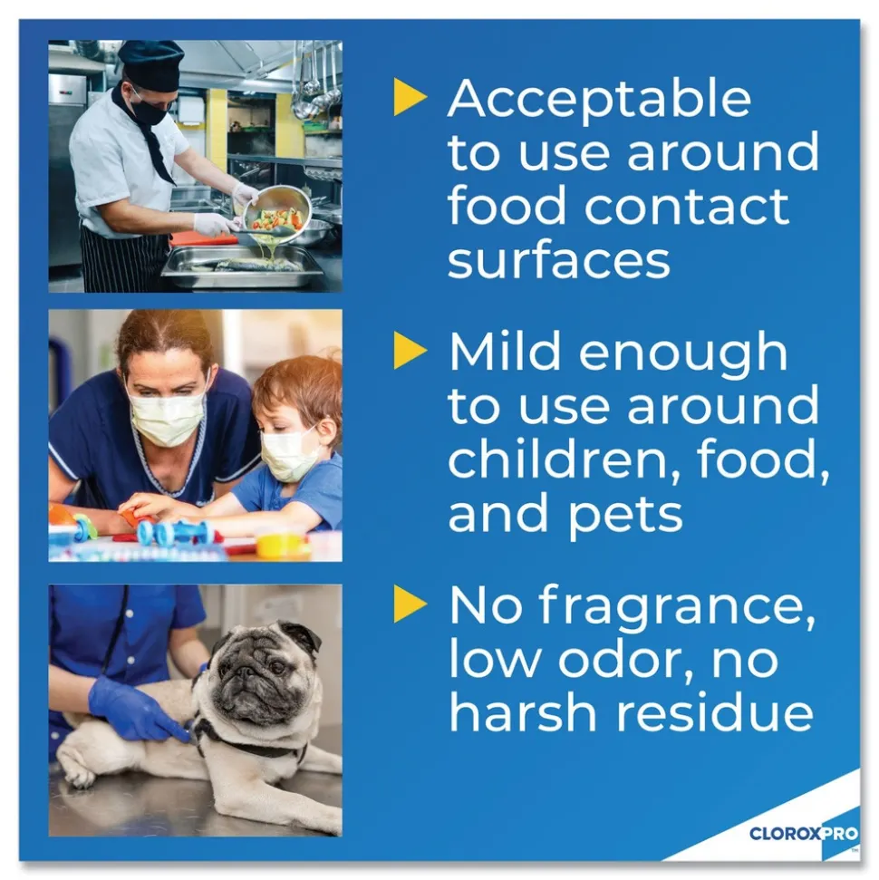 Gentle enough to use around kids, pets and food contact surfaces; use for daycare equipment and desks, kennels, gym equipment, cafeteria table tops and much more