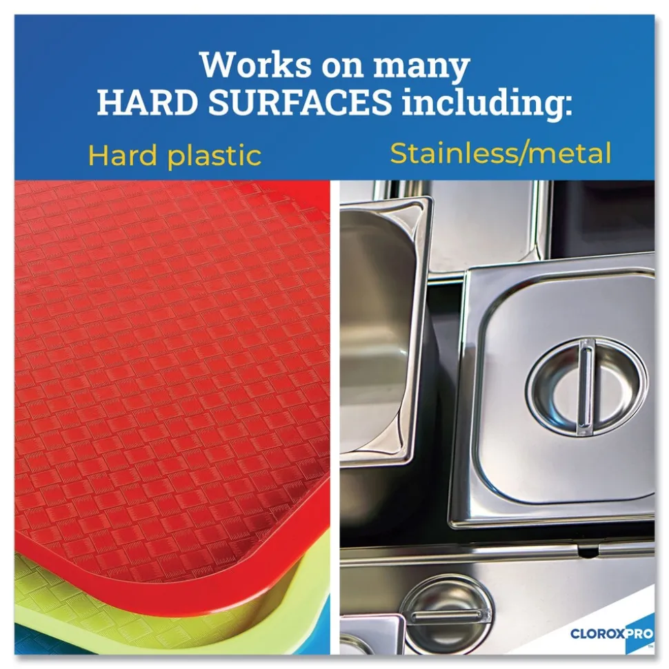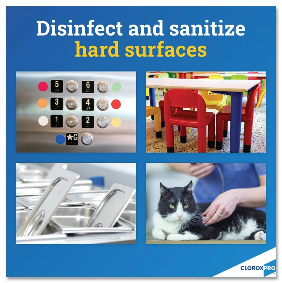 CloroxPro Anywhere Hard Surface Sanitizing Cleaner is designed for use with sprayer devices, including the Clorox Turbo Sprayer Device, to provide full coverage, one-step sanitization of hard surfaces. Certified by NSF, CloroxPro Anywhere Daily Disinfectant and sanitizer kills cold and flu viruses and 99.9% of bacteriaincluding Coronavirus (on hard nonporous surfaces when used as directed) and Influenzawith a spray that’s pH-balanced. As a hypochlorous acid based formula, the cleaner is tough on bacteria yet mild enough to use around kids, pets and food, thanks to its low odor and no residue. This sanitizing spray is well suited for commercial spaces and intended for use in airports, public restrooms, day care centers, kennels, laundry rooms, offices and schools. The versatile pH-balanced formula can be used on most surfaces anytime, anywhere.