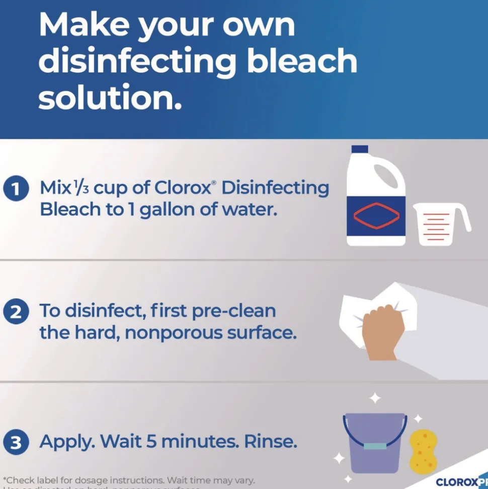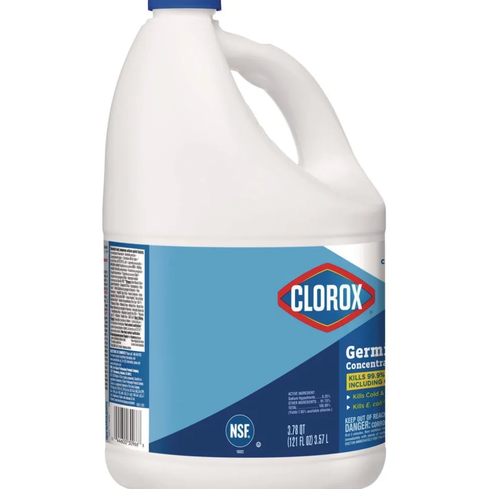 Show those germs who’s boss with Clorox Germicidal Bleach from CloroxPro. This bleach is EPA-registered to kill 39 organisms, including multiple strains of MRSA, norovirus, flu virus, E. Coli, listeria and Salmonella when used as directed on countertops, floors, toilets and more. It meets EPA criteria for use against SARS-CoV-2, the virus that causes COVID-19. This 121 ounce bottle of bleach makes 30 gallons of germ busting cleaning solution to remove stains and kill mold and mildew. Clorox Germicidal Bleach also can be used in the laundry room to make whites whiter. It removes the toughest laundry stains from white clothes including red wine, grass, dirt and blood stains. It is safe to use in standard and high-efficiency washing machines. Ideal for use in busy healthcare environments, offices, schools and other commercial facilities. CloroxPro, where clean means everything. Packaging may vary.