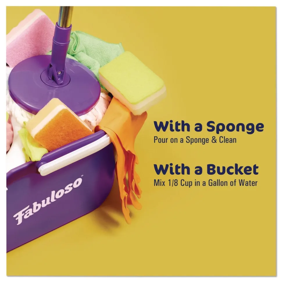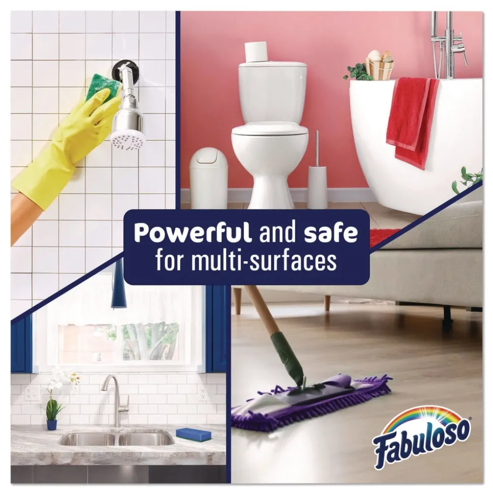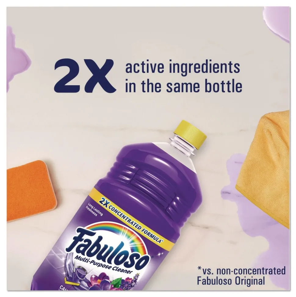 Fabuloso Multi-Purpose Cleaner, 2X Concentrated Formula transforms your home or business with a fresh scent that lasts. Bring the fragrance of Fabuloso indoors, and experience a warm, joyful feeling your friends and family will love. Fabuloso’s 2X Concentrated Formula now provides 2x more active ingredients compared to non-concentrated Fabuloso Original, giving you 2x the dosage in the same bottle. Every colorful pour from the easy-pour bottle delivers a long-lasting, unmistakable freshness and leaves your home bright and clean. Use Fabuloso Multi-Purpose Cleaner, on sinks, toilets, tubs, showers, kitchen and bathroom floors, sealed wood surfaces, appliances, counters, windows, mirrors, walls, doorknobs and furniture, and fill every room in your home with joy.