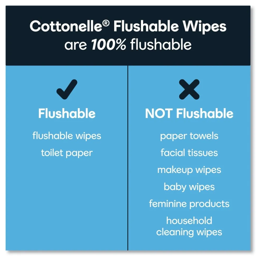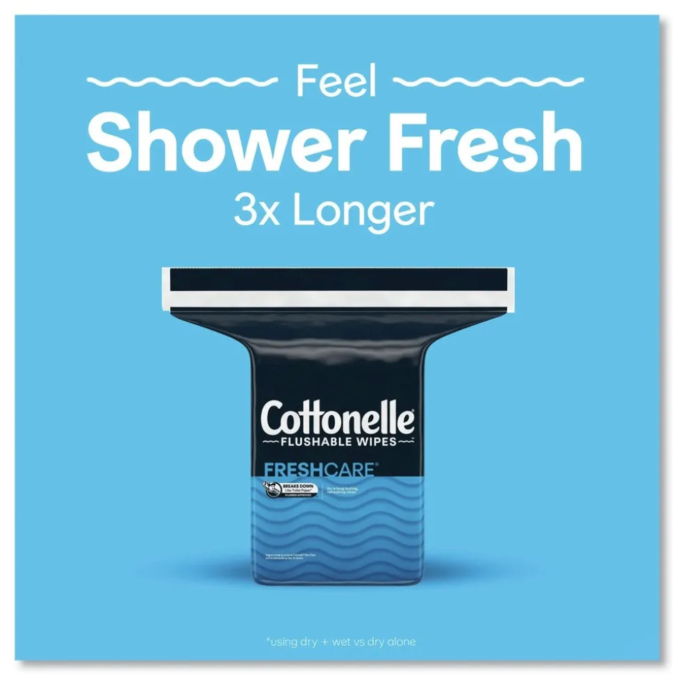 For a superior clean that’s fresh, gentle, and effective, choose Cottonelle FreshCare Flushable Wipes with the CleaningRipples Texture. Cottonelle bathroom wipes are 100% flushable, remove odor-causing bacteria and offer a large, dual layer wipe to clean better than when using dry toilet paper alone. These sanitary wipes are sewer-safe and septic-safe. Using dry + moist vs. dry toilet paper alone.