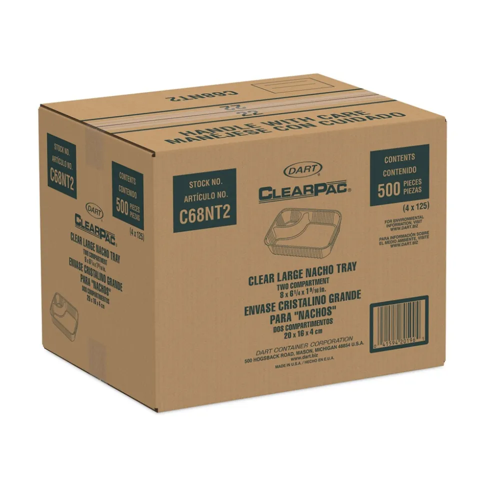 Our containers not only look great, they make serving food easy! Crystal clarity allows what’s inside to be the star of the show. These two-compartment nacho trays ensure efficient portioning and on-the-go enjoyment! Serve traditional tortilla chips with nacho cheese, soft pretzel bites with dip, or tater tots with ketchup! The combinations are endless. Perfect for concessions and food trucks!