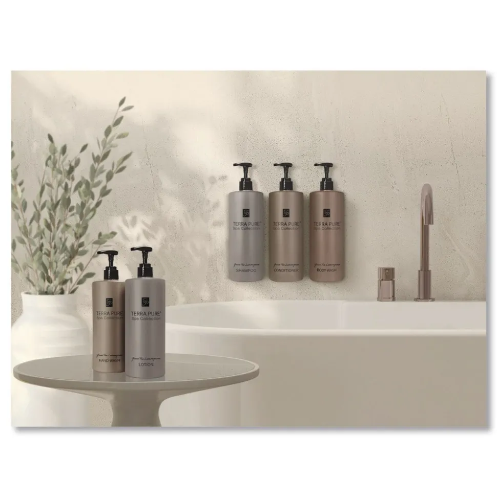 Featuring a refreshing fragrance, the Terra Pure Conditioner is infused with fresh aloe vera and pure olive oil. These liquids have paraben- and gluten-free formulas. The EcoLux Air pump dispenser works with a concealed, tamper-resistant bracket (sold separately) to create a sleek system with a modern, seamless line. To change out the long-lasting bottle, a quick press of the key releases the empty dispenser. Then simply slide down a fresh conditioner bottle to lock it into place. The effortless process significantly reduces housekeeping time for overall cost savings.
