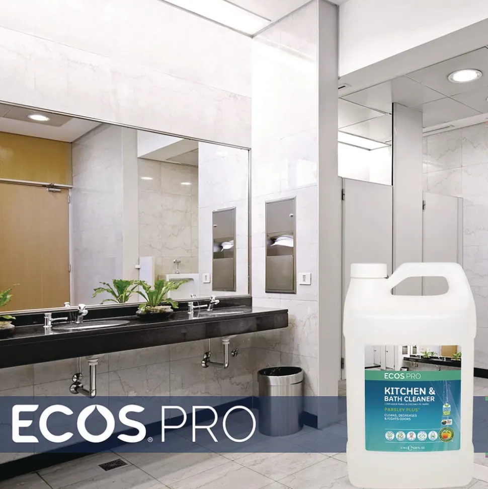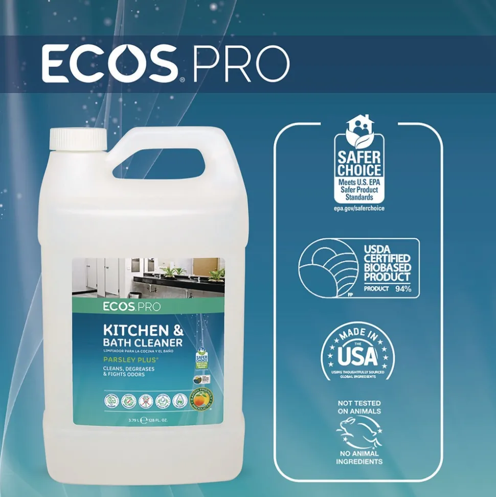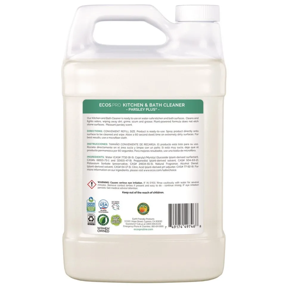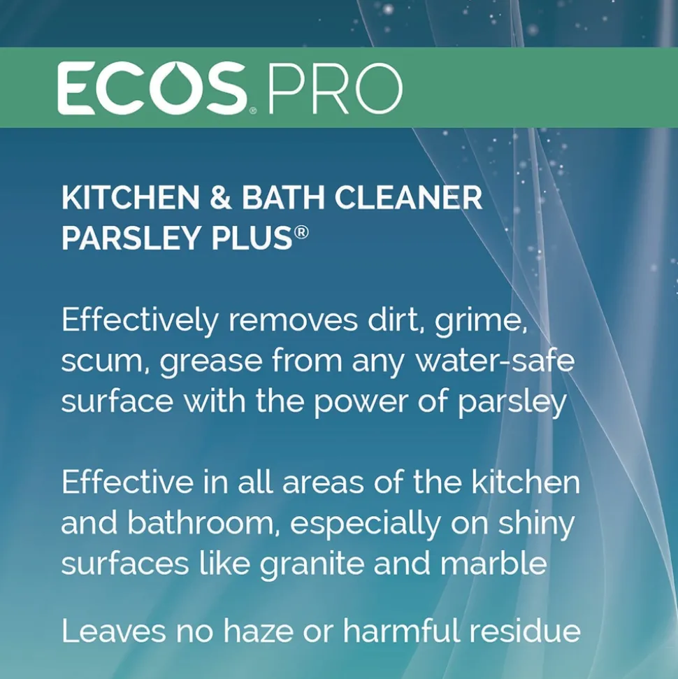 The ECOS PRO Parsley Plus all-purpose kitchen and bathroom cleaner and degreaser washes and fights odors with the natural power of parsley. This pH-balanced formula removes dirt, grease, grime, and scum from water-safe surfaces. Cleans and shines all areas of the kitchen and bathroom; works exceptionally well on granite and marble, leaving no haze or residue even on high-shine stone surfaces. Made using sustainable, plant-powered ingredients. Made without dyes; gray water and septic safe. Features a pleasant parsley scent. Not tested on animals. Manufactured in a facility that is LEED Zero Carbon, LEED Zero Waste, and LEED Zero Energy Certified.