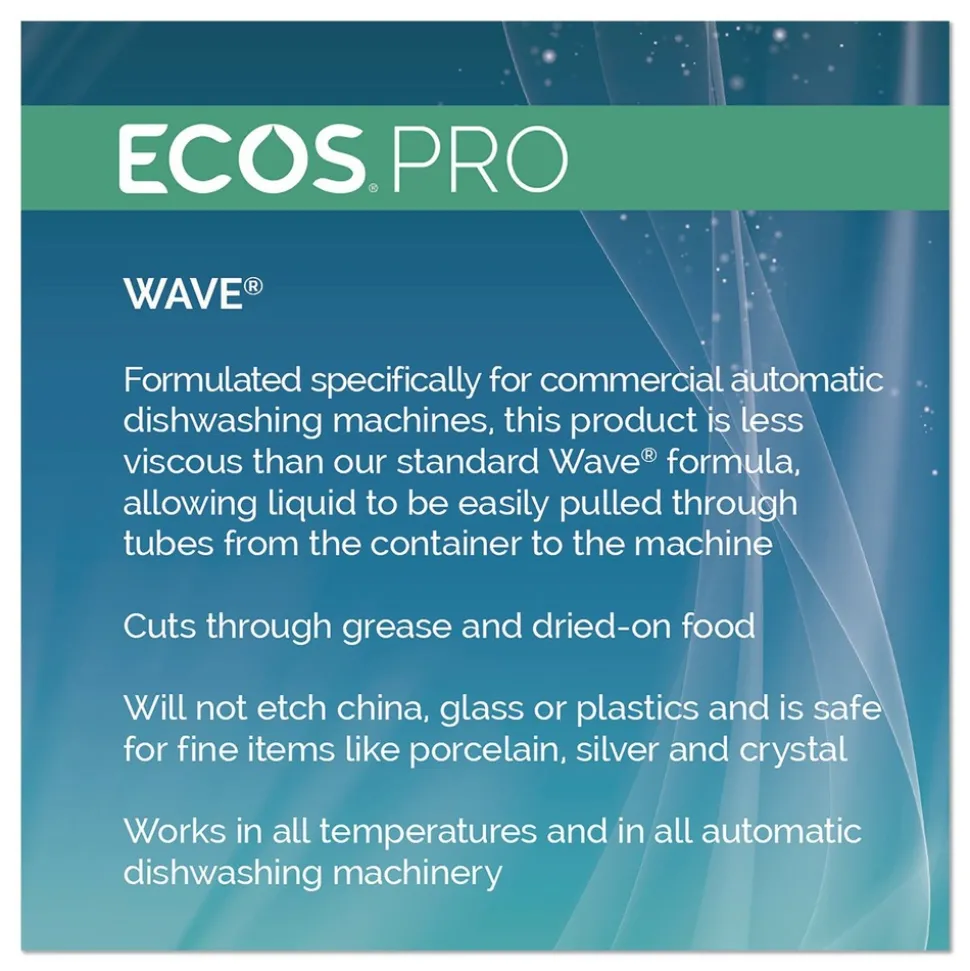 Make your plates, utensils, and glasses shine with this ECOS PRO Wave automatic commercial dish machine detergent liquid. This detergent is formulated specifically for commercial automatic dishwashing machines. Cuts through grease and dried-on food. Will not etch china, glass or plastics, and is safe for fine items like porcelain, silver and crystal. Works in all temperatures and in all automatic dishwashing machinery. This pH balanced formula is made using several sustainable, plant-powered surfactants. Made without dyes; graywater and septic safe. Not tested on animals. Manufactured in a facility that is LEED Zero Carbon, LEED Zero Waste, and LEED Zero Energy Certified.