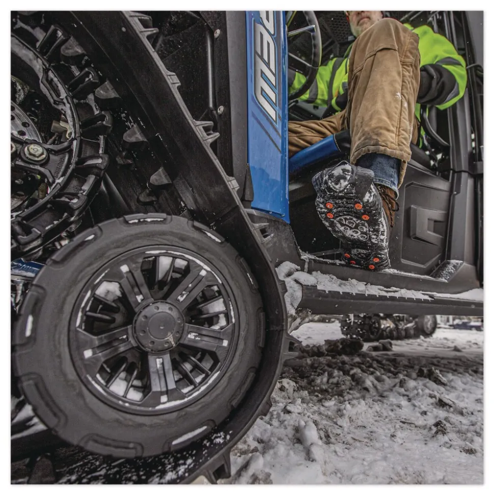 The TREX 6300 Slip-On Ice Cleats are lightweight ice grips for boots with eight replaceable spike grips and one-piece design for a snug fit over winter boots to prevent slip and fall injuries on the ice. These ice cleats provide tenacious traction and extra stability on ice and snow. These ice grippers feature eight rugged carbon steel cleats on the ball and heel of foot for grip on slippery terrain. These will fit over any style of boot or shoe for traction and stability during winter work or other winter outdoor activities. Tested to be flexible in temperatures down to -40F (-40C), the stretchable rubber material provides a secure fit and easy slip-on/off wear. These snow cleats are lightweight and can be folded small enough to be stored in a pocket or pack when not being worn. Stretchy design means no tightening or adjustments needed and should fit snugly on your boot or shoe. Use your shoe/boot size to determine the approximate size.