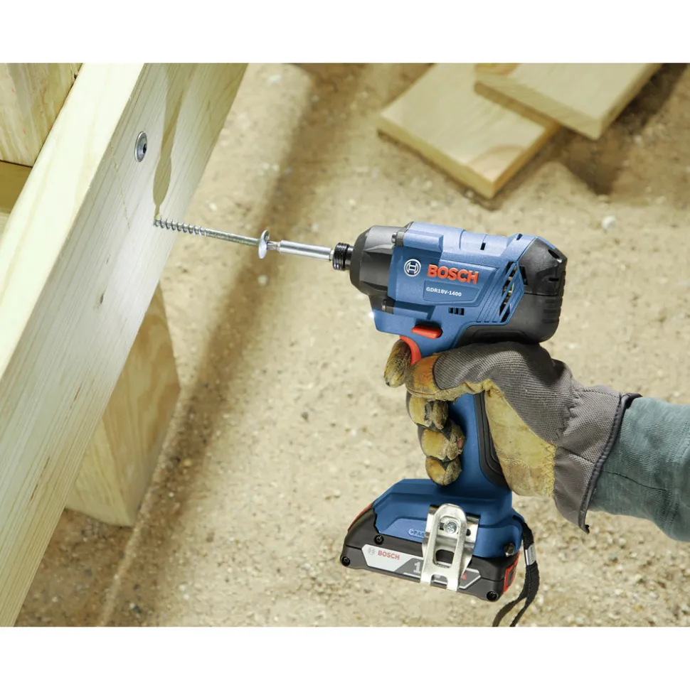 The Bosch GDR18V-1400B12-RT 18V 1/4 in. Hex Impact Driver kit features an ergonomic tool for professional-grade fastening applications, due to a compact design and 1400 in-lbs. of max torque. The impact driver supplies power transmission designed for medium-duty fastening and drilling applications, with 0 – 3600 no-load impacts per minute and 0 – 2800 RPM. It features Bosch’s hammer-and-anvil system, designed to concentrate torque to the tool, not the user. The tool features the well-balanced Compact Impactor design, with a head length of just 5.9 in., a weight of only 2.3 lbs. (tool only, not including battery) and a soft slim-grip handle. The quick-change 1/4 in. hex drive chuck features a power groove for enhanced bit grip. The kit comes with (1) 18V 2 Ah SlimPack battery and an 18V charger.