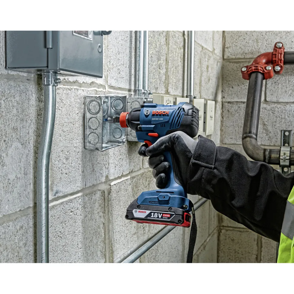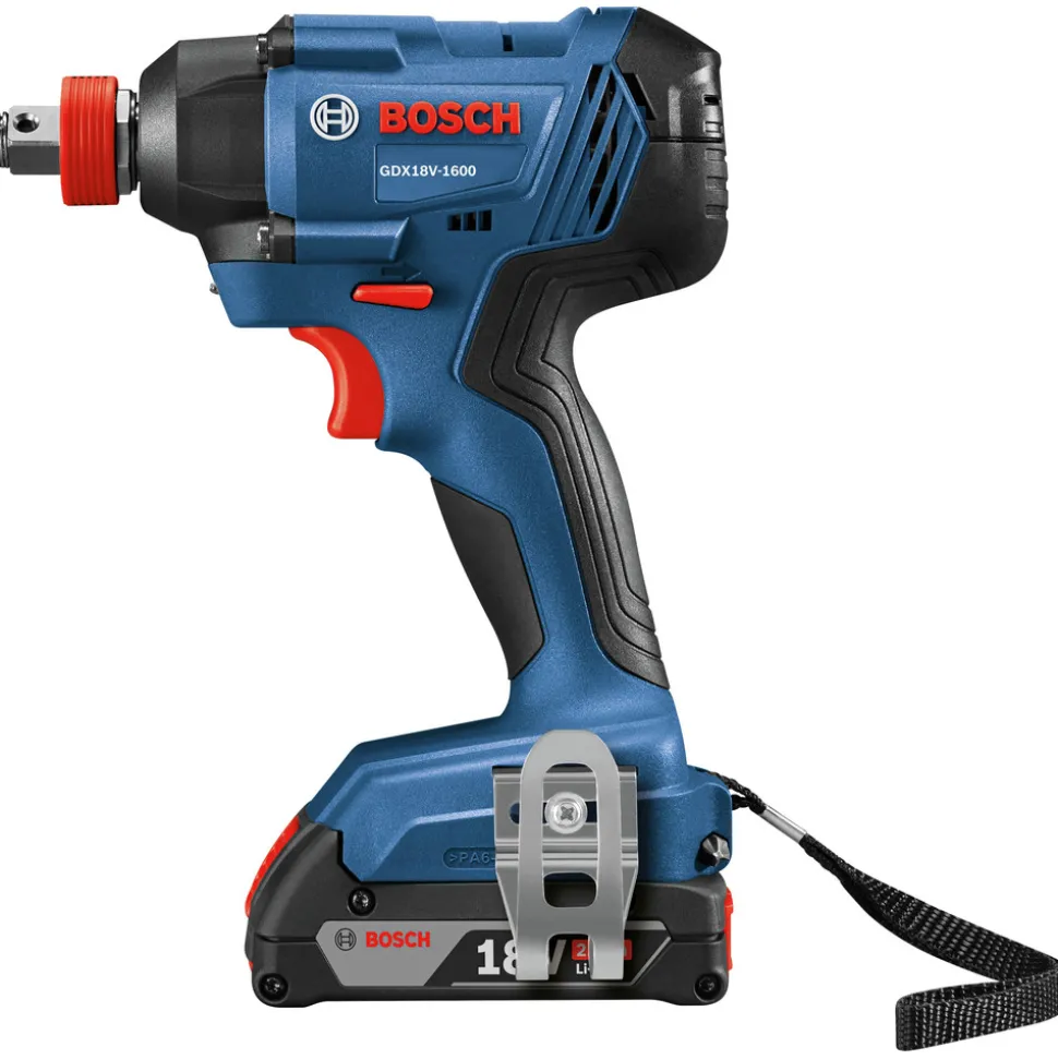 The Bosch GDX18V-1600B12 18V 1/4 In. and 1/2 In. Two-in-One Bit/Socket Impact Driver delivers results, with the two-in-one bit/socket drive that offers a 1/4 In. quick-change hex shank holder with power groove for bits, and a 1/2 In. square drive for sockets. This innovative tool provides versatility while eliminating the use of socket adapters on a cordless drill. The impact wrench and driver’s efficient, powerful cordless motor produces up to 1,600 In.-Lbs. of torque, while the Bosch hammer-and-anvil system provide maximum impact energy and up to 0-3,600 impacts per minute. The variable-speed trigger provides accurate driving speed. The driver has an LED light system to illuminate the work area. The kit comes with one 18V 2.0 Ah SlimPack batteries and a charger.