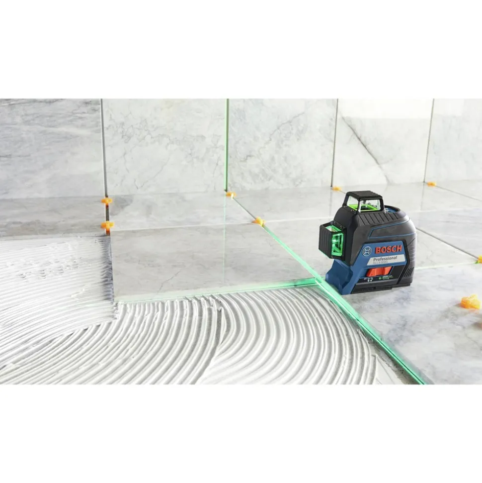 The Bosch Factory Reconditioned GLL3-300G 360 Degrees Three-Plane Leveling and Alignment-Line Laser features an all-in-one level and alignment solution. This leveling laser provides fast one-spot job setup. It allows users level, align, square and plumb with one setup point by generating three 360 degrees laser planes – one horizontal and two vertical. It uses green-beam technology, which generates lines up to 4x brighter than standard red beams. The GLL3-300G has a visible range of up to 200 ft. diameter. The leveling laser features pulse mode, extending the working range up to 300 ft. diameter and/or in bright lighting, using the optional LR8 receiver. The VisiMax Technology drives maximum line visibility. The included BM1 positioning device mounts to magnetic surfaces, stands on floor with retractable feet and mounts to drywall or wood. It has a microfine height-adjustment system, which provides quick adjustment and secure locking of the working height.