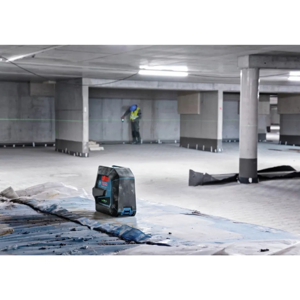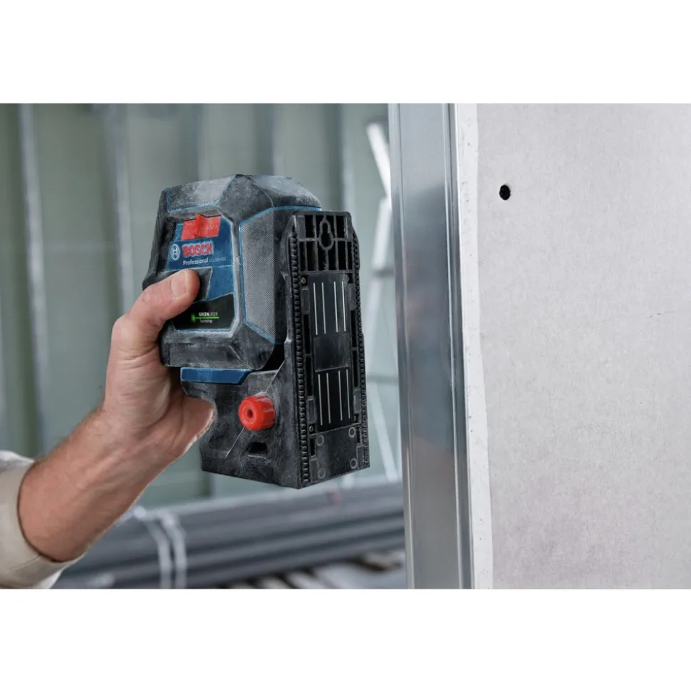 The Bosch GCL100-40G Green Beam Self-Leveling Cross-Line Laser with Plumb Points uses green-beam technology, which emits green lines and points up to 4X brighter than standard red beams. This gives the laser a working range for the lines of up to 165 ft. The laser produces vertical, horizontal, cross-line modes, as well as upward and downward green plumb points. The tool can project 2 lines independently or together, for a broad array of alignment and leveling applications. It includes Bosch-exclusive VisiMax technology, which monitors tool temperature and power consumption to deliver the brightest line for the job. The tool has full rubber overmold housing, designed to be similar to a roll cage, so every major impact point is reinforced with rubber. It is an IP64 rating, and features deeply recessed windows help protect the laser glass. The onboard user interface allows easy selection among the layout modes. The Bosch Smart Pendulum System self-levels and indicates out-of-level condition, and it locks the pendulum for secure transport. The included RM10 Rotating Mount offers quick setup, extra-strong magnets, and fine adjustment rotating knob.