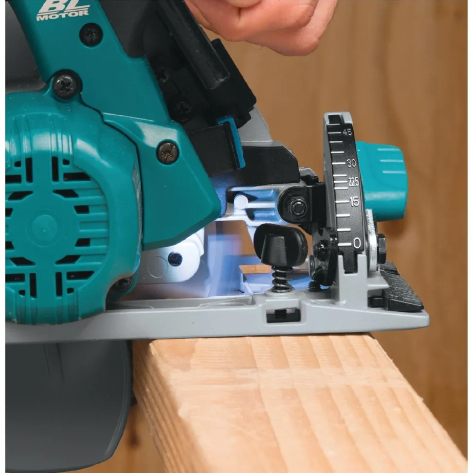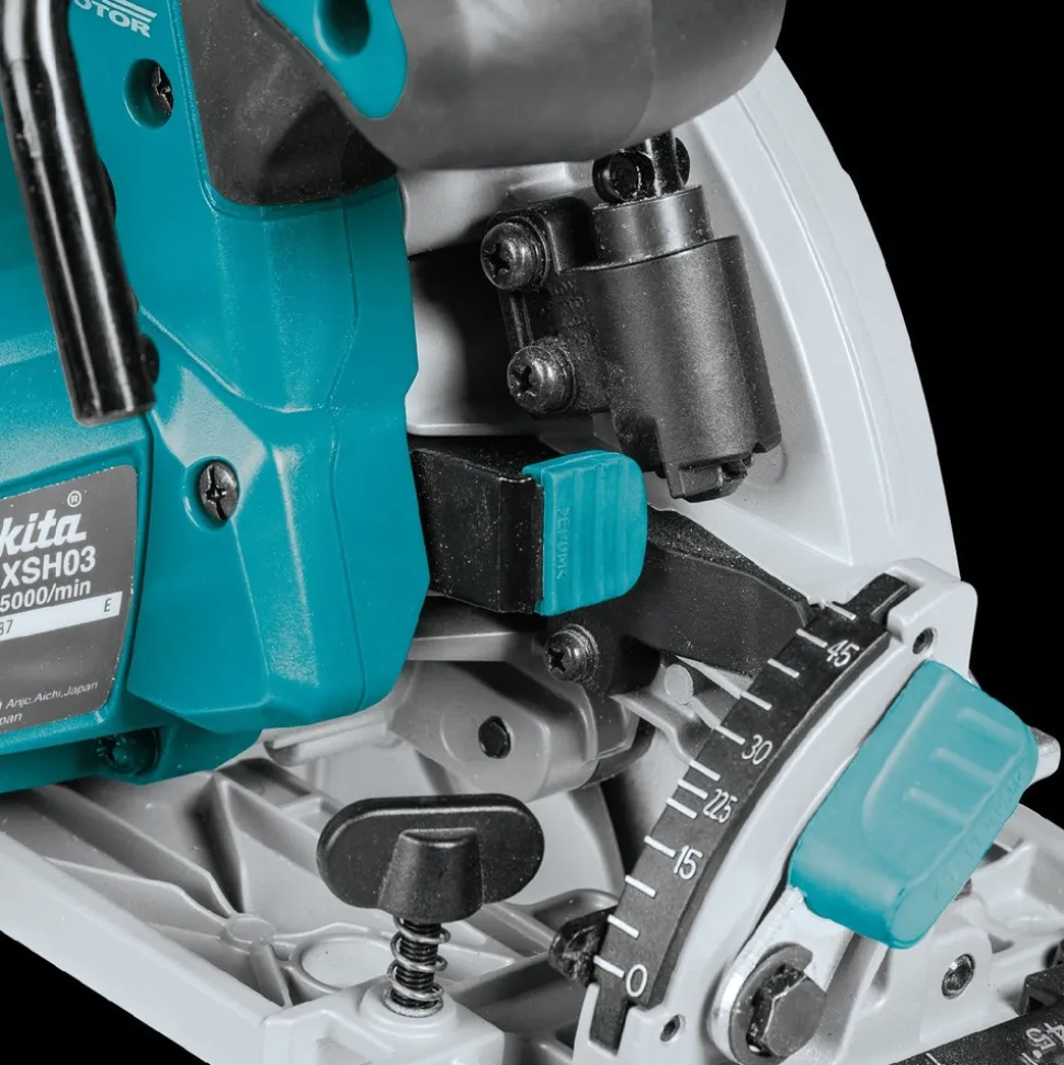 Makita is the innovation leader in brushless motor technology, and the 18V LXT Lithium-Ion Brushless Cordless 6-1/2” Circular Saw (model XSH03Z, tool only, battery and charger sold separately) combines power and run-time for faster cutting and ripping – without the cord. The XSH03Z is equipped with Automatic Speed Change Technology, which adjusts speed and torque during operation for optimum performance. The Makita BL Brushless Motor is engineered for longer run time, increased power and speed, and longer tool life.