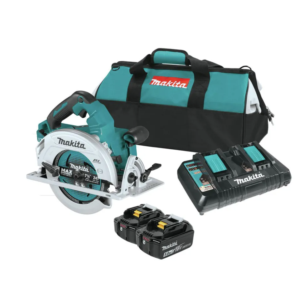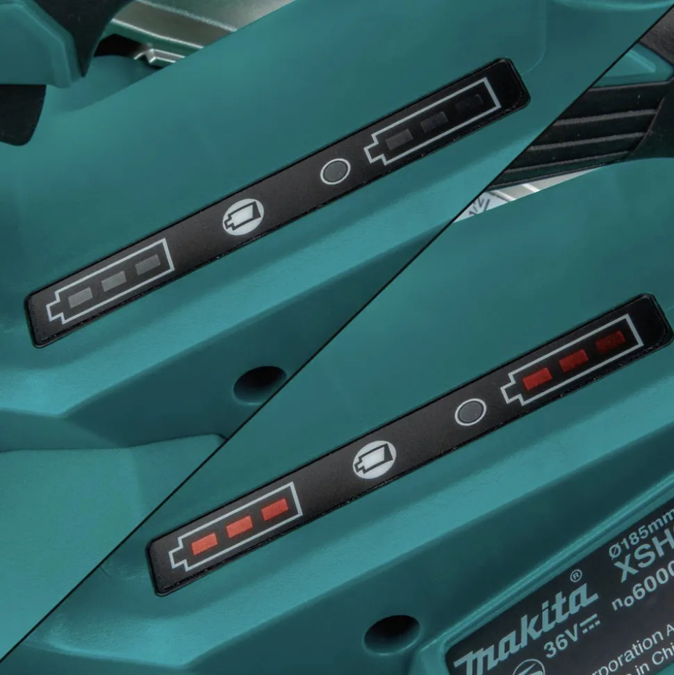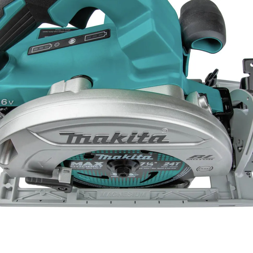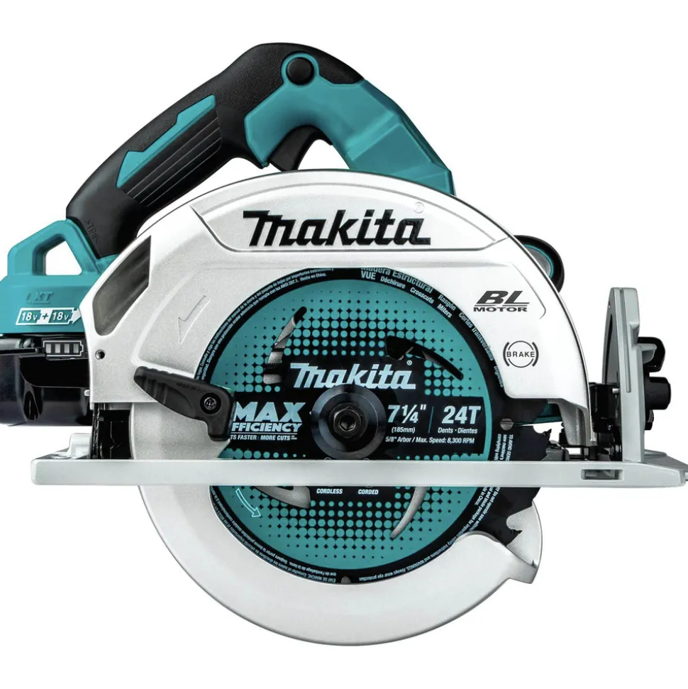 Makita, a pioneer in brushless motor technology and battery innovation, combines both in the 18V X2 LXT (36V) Lithium-Ion Brushless 7-1/4 in. Circular Saw Kit (XSH06PT-R). It’s powered by two 18V LXT Lithium-Ion batteries for maximum performance, and has an electronically-controlled BL Brushless motor that matches torque and RPM to the application. Makita 18V X2 means freedom from the cord, even for demanding applications like cutting sheet and dimensional lumber that traditionally called for a corded saw. Best of all, users can remain in one battery platform, using the same fast-charging 18V batteries with the XSH06PT-R as they use across the expansive Makita 18V LXT cordless tool system.