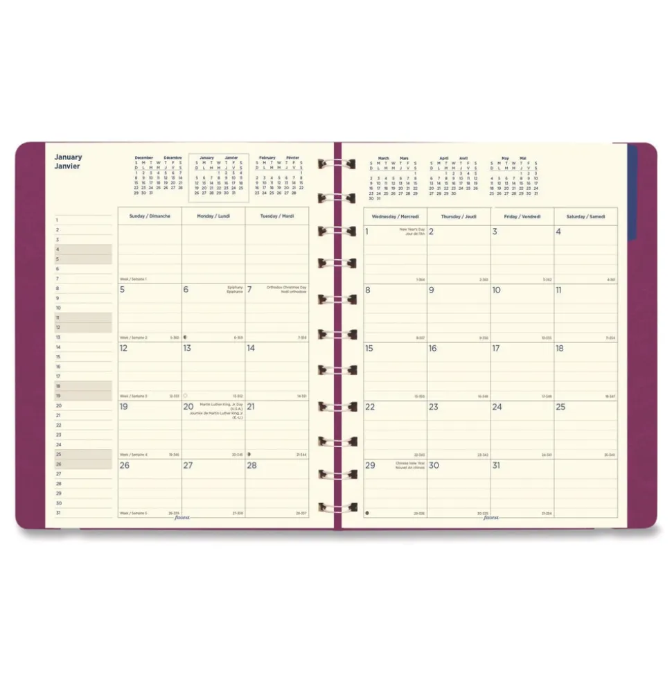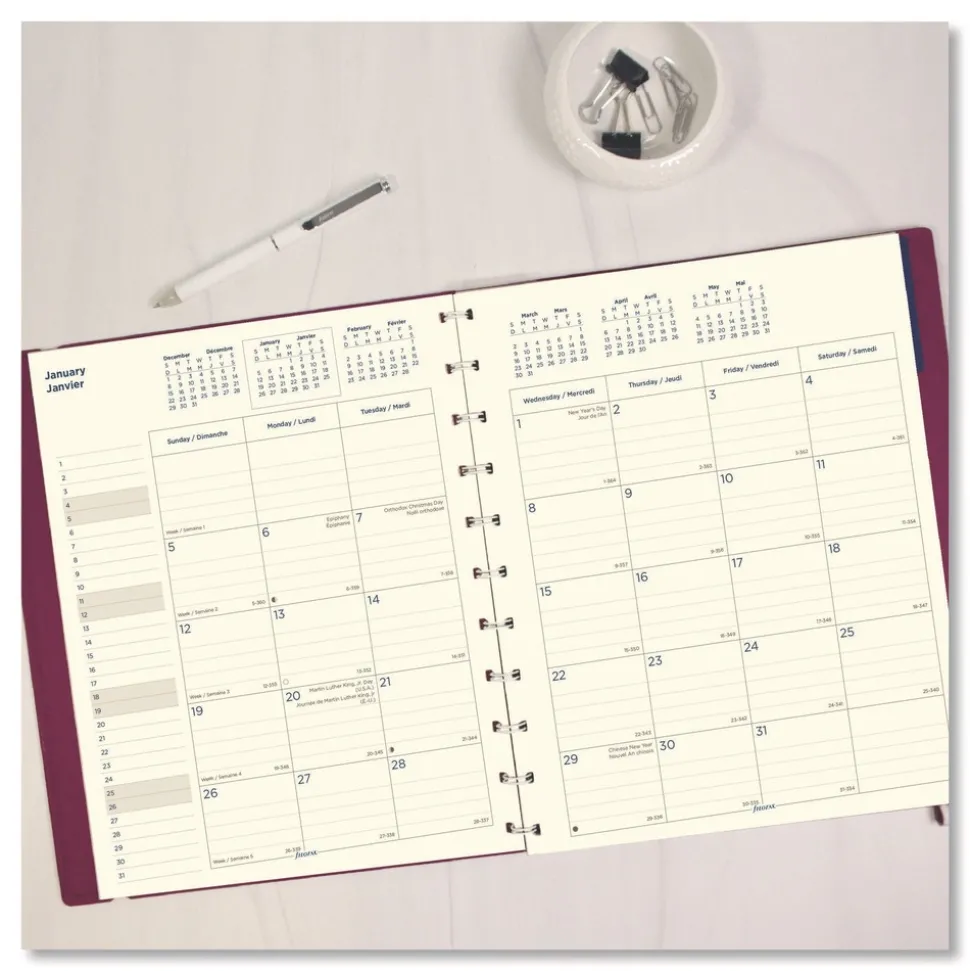Planner features a beautiful soft touch leather-look cover with twin-wire binding and an elastic closure with piping detail. One month per two-page spread. Includes cream-colored, fountain-pen-friendly paper, a ruler/page-marker, 40 repositionable note pages and one moveable colored index with a pocket.