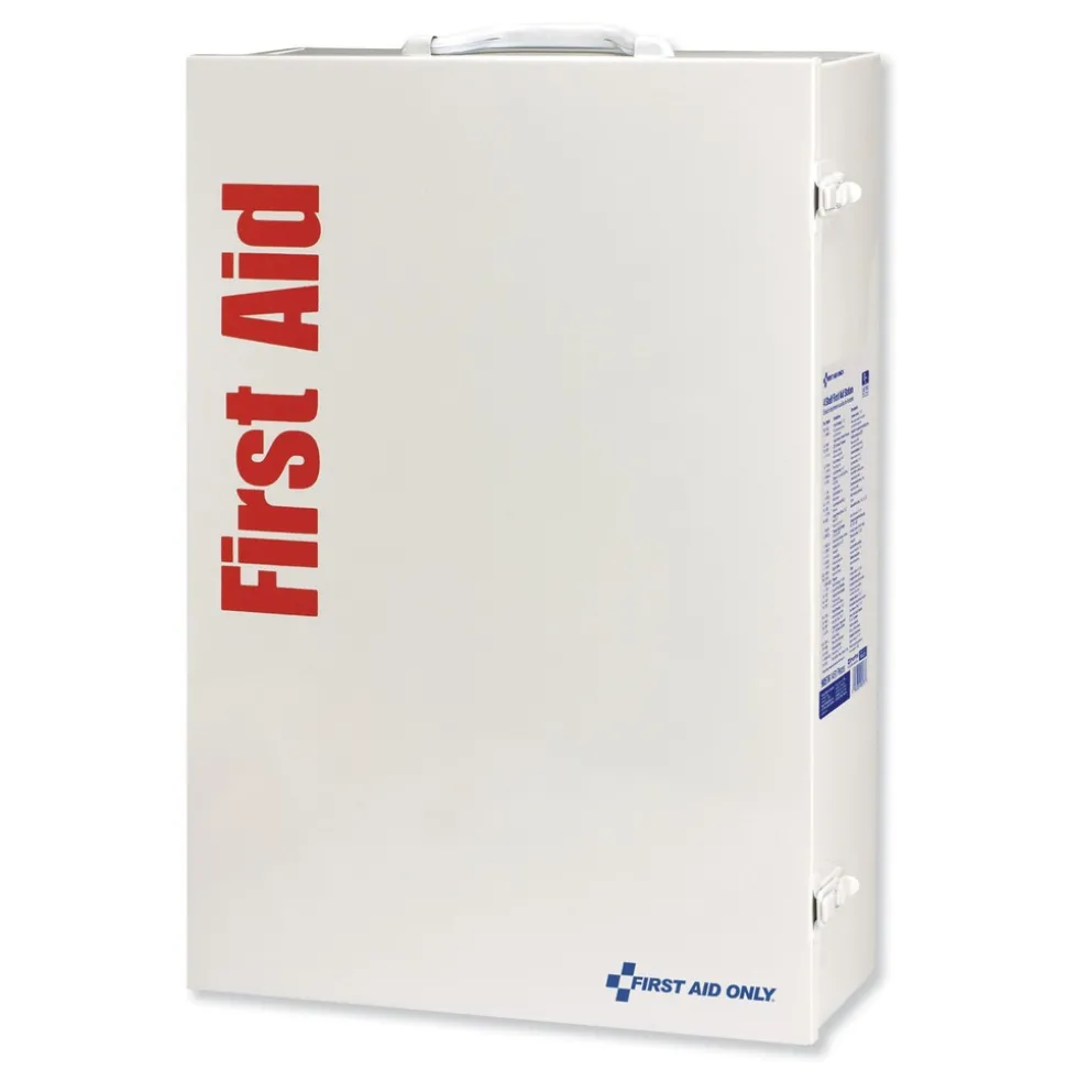 Four shelf industrial first aid station is designed for businesses, offices and work sites. Sturdy solid steel case comes with a convenient carrying handle. Case is also wall mountable. First Aid Cabinet is ANSI Class B+ compliant. Solid steel case comes with a carrying handle and is wall mountable. Sufficient to treat 150 to 200 people. Contents exceed the 2015 ANSI Class B requirements. 1461 pieces.