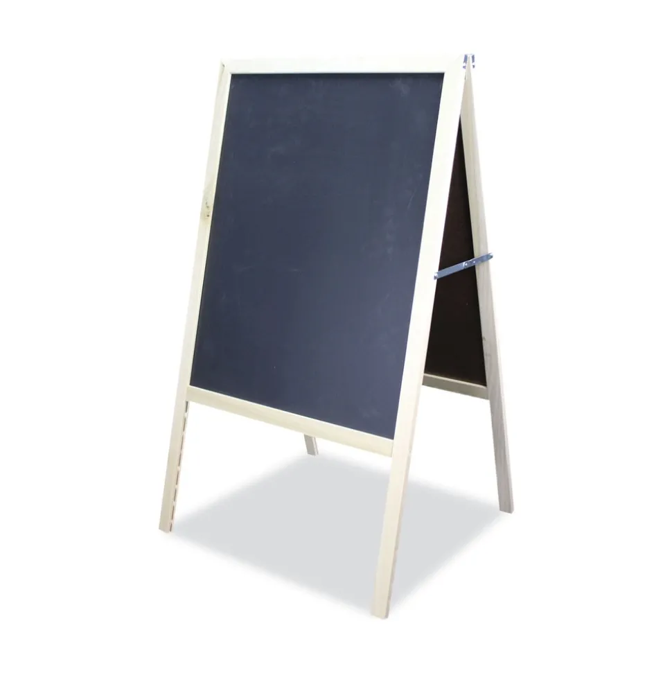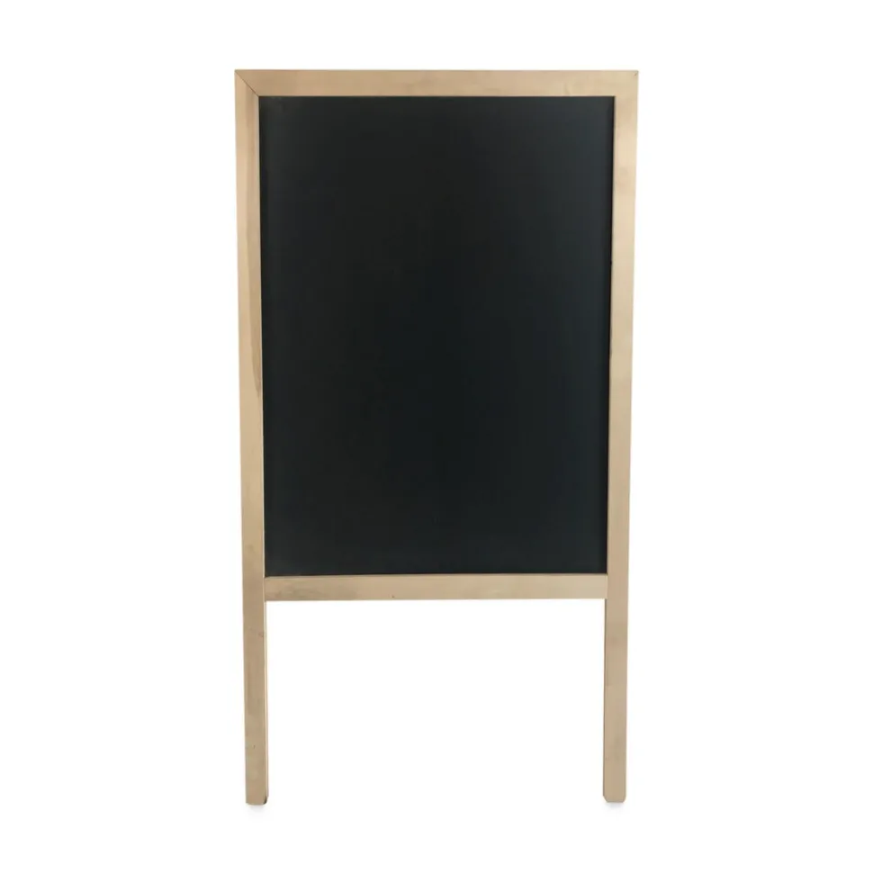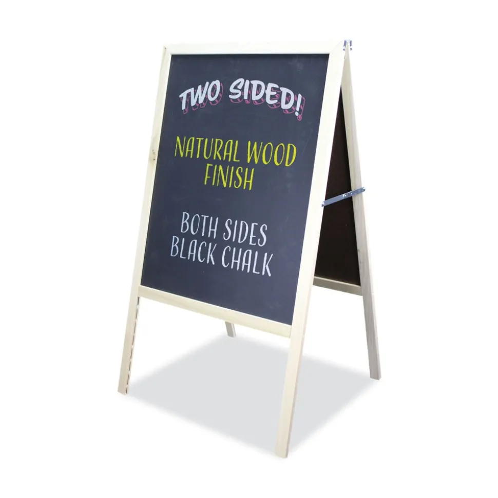This dual-sided, marquee sign with built-in A-frame stand is perfect for signage indoors or out. You can even place it on the sidewalk to advertise special sales and events. It’s ideal for customized announcements, menus and so much more. Black chalkboard surface is offset by an attractive, natural wood frame. Folds flat for easy storage.