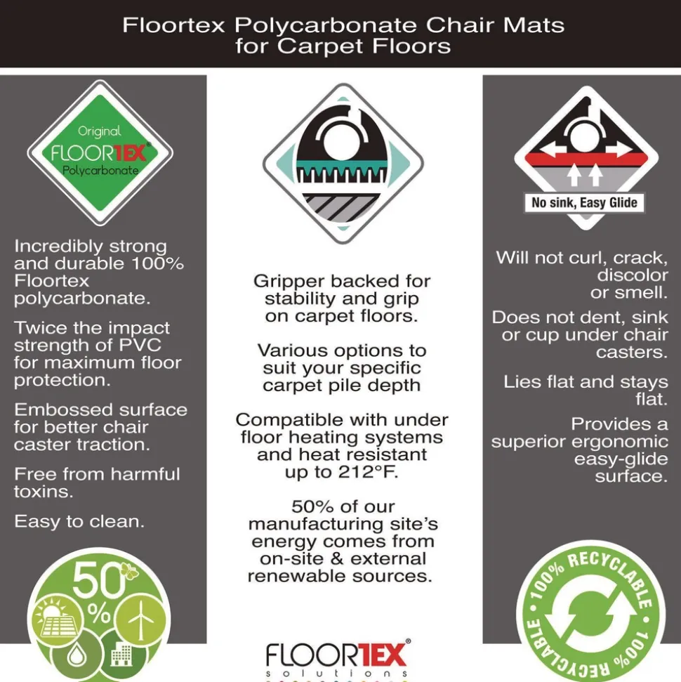 Floortex Original Polycarbonate chair mats provide the ultimate in quality, durability and clarity. Twice the impact strength of vinyl to provide a perfect easy glide ergonomic surface for caster based chairs. Polycarbonate will not curl, crack, dimple, discolor or smell under normal use. High clarity allows the beauty of flooring to shine through. Manufactured using 25 percent renewable energy. Gripper back for low/medium pile carpets up to 0.5 in. thick.