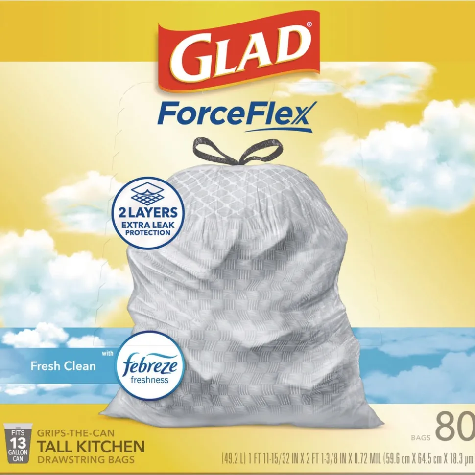 Fight nasty kitchen odors with Glad trash bags. Glad Kitchen Drawstring Trash Bags are designed with ForceFlex technology to give extra flex as it expands around sharp edges and heavy loads, so you can pack it in while resisting tears, rips and punctures. Keeps your kitchen smelling pleasantly fresh with long lasting odor control. Let the stretchable strength of Glad handle all the messes our busy daily life can throw at it and then some. With double-sided seals and a reinforced bottom, these bags are designed with RipGuard and LeakGuard technology to prevent seepage of liquids and keep trash contained. The durable Grips-The-Can Drawstring ensures a tight grip on the trash can to keep it in place. Take the trash to the curb with no fear of leaks and tears, and no frustration. Keep your kitchen smelling clean with the stretchable strength of Glad. Ideal for use in offices, schools, daycare centers, restaurants, hotels and other commercial facilities.