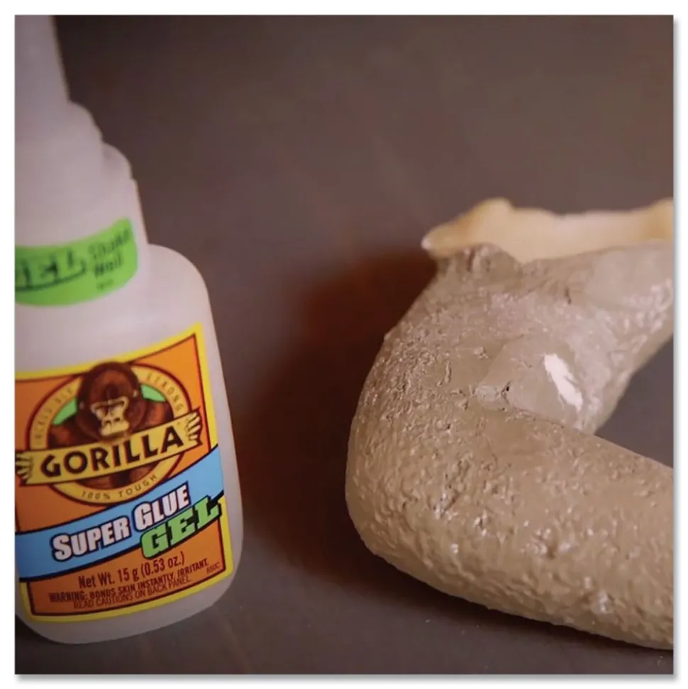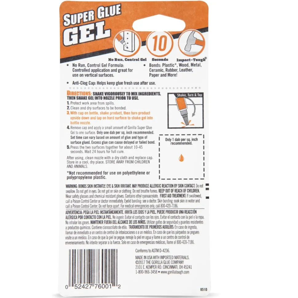 Gorilla Super Glue Gel is an easy-to-use, thicker and more controlled formula great for multiple surfaces and vertical applications. Impact tough and reinforced to increase impact resistance and strength. Anti-clog cap keeps glue from drying out. Versatile and bonds plastic, wood, metal, ceramic, rubber, leather, paper and more. Fast setting and dries in 10-45 seconds with no clamping required.