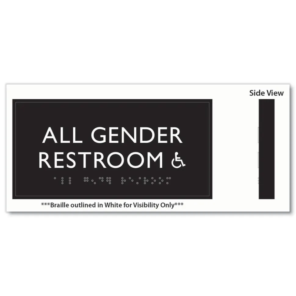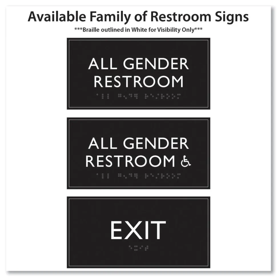 Universally and easily recognizable white graphics. Raised tactile graphics with Grade 2 Braille. Meets Americans with Disabilities Act (ADA) requirements. Includes double-side adhesive tape for mounting to door or wall.