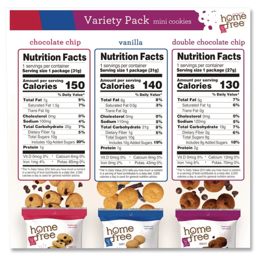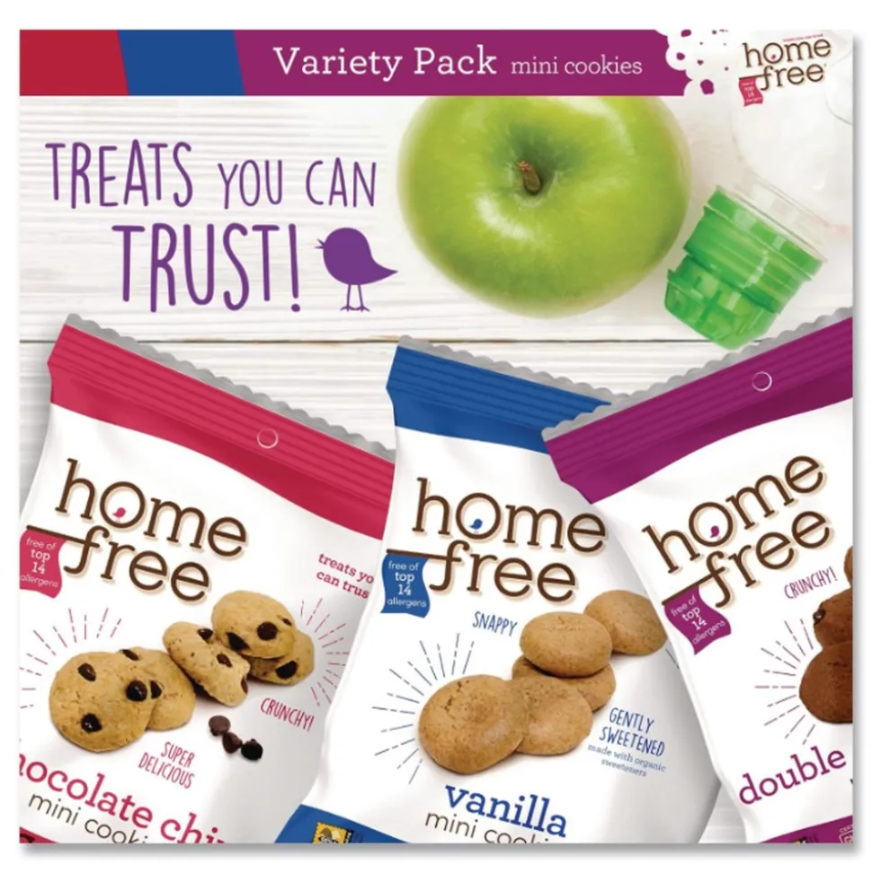 Everyone can join in snack time with this delicious variety pack of gluten-free, whole grain mini cookies. Great for special dietary needs; these cookies are also low glycemic and nut free. Multiple flavors for multiple tastes: single serve bags of crunchy cookies in Chocolate Chip, Double Chocolate Chip, and Vanilla. All Homefree cookies are free of the eight most common food allergens (except soy lecithin in the Chocolate Chip Mini Cookies) and are certified as a good source of whole grain. The vanilla mini cookies are low glycemic and certified organic (70 percent organic ingredients).
