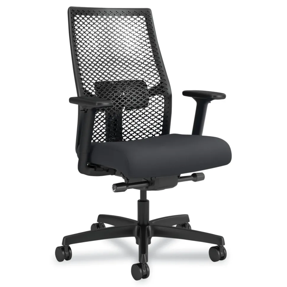 ReActiv mesh-back design delivers total zonal comfort with the perfect balance of the right type and right amount of support. Advanced synchro-tilt mechanism with seat slider offers a full range of reclining positions. Tilt tension controls the rate and ease of recline and the upright tilt lock secures the chair in the full upright position. Unique, back-cushion-style lumbar support is height adjustable: up and down, to provide personalized support and extra relief where you need it. Pneumatic seat height adjustment moves the seat up and down to adapt to various body heights. Adjustable arms allow you to set their height and width to best accommodate you.