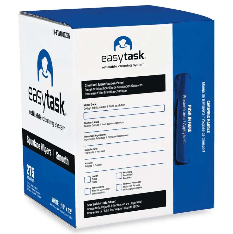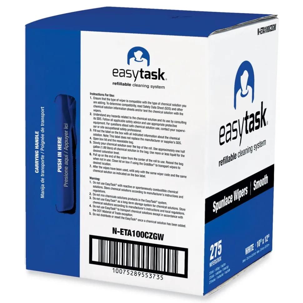Easytask Refillable Cleaning System, create your own pre-sat wiper. Portable GrabBox contains centerpull roll in a resealable bag. Sanitizer/disinfectant compatible, holds half gallon of solution. Spunlace wiper offers excellent absorbency. Maximum strength, no lint, no binders and solvent resistant for general purpose wiping. Refill for the GrabBox or other delivery system.