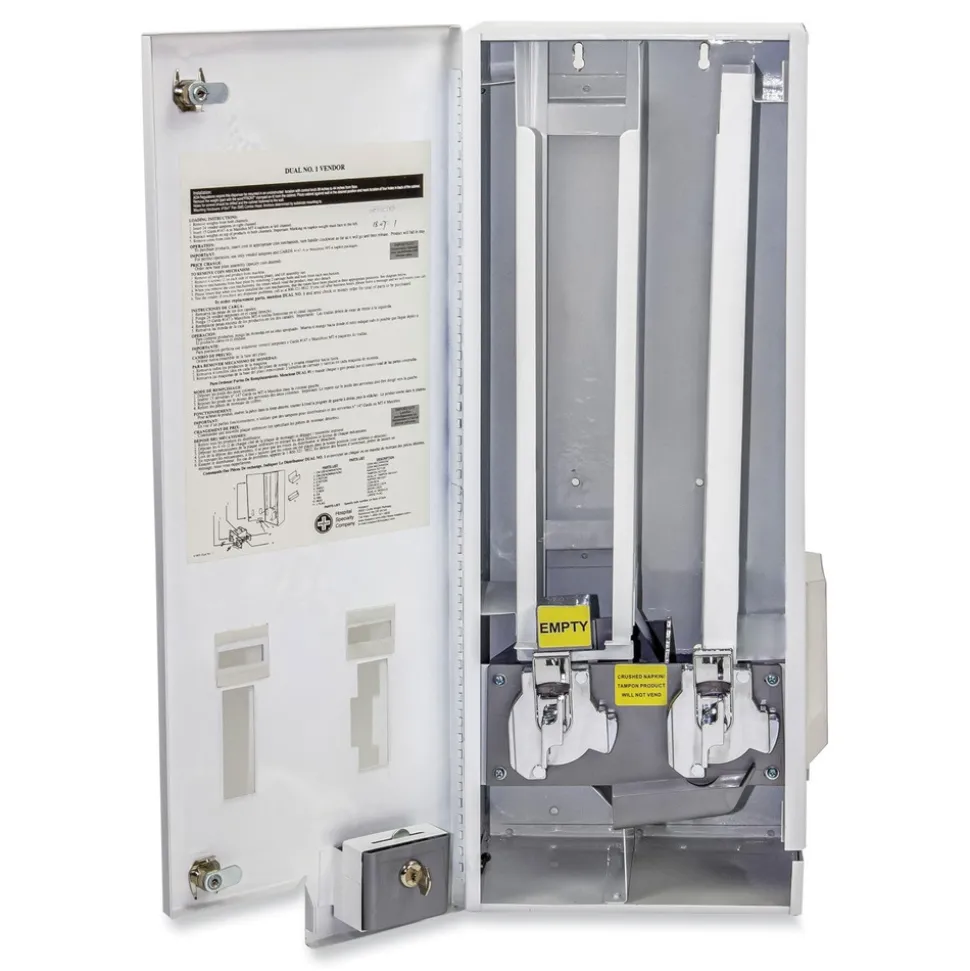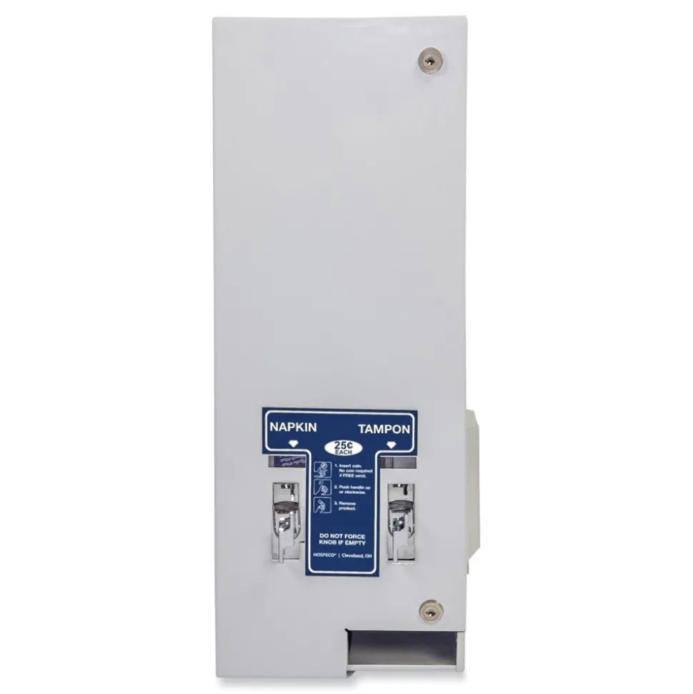 Coin operated dual slots. All-metal construction. Holds 15 #4 napkins and 22 Tampax tampons (sold separately). Separate locks for supplies section and coin box.